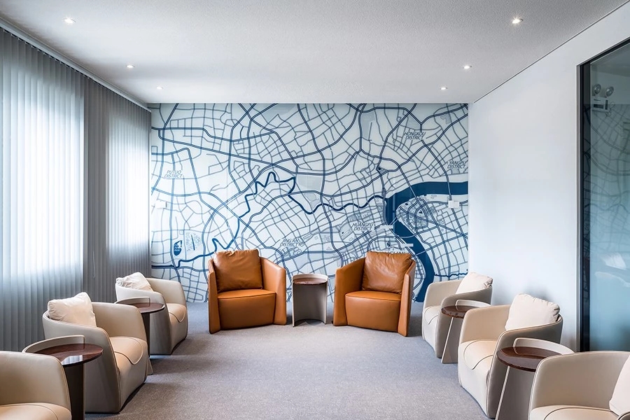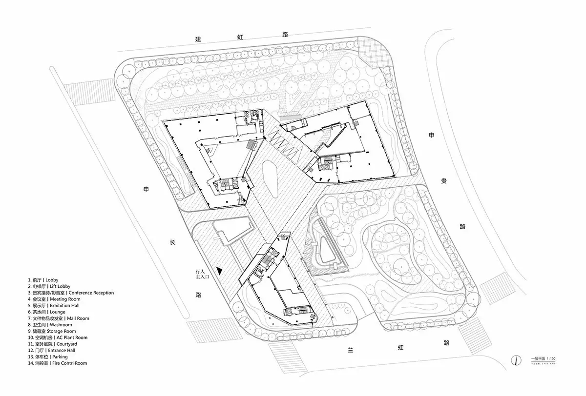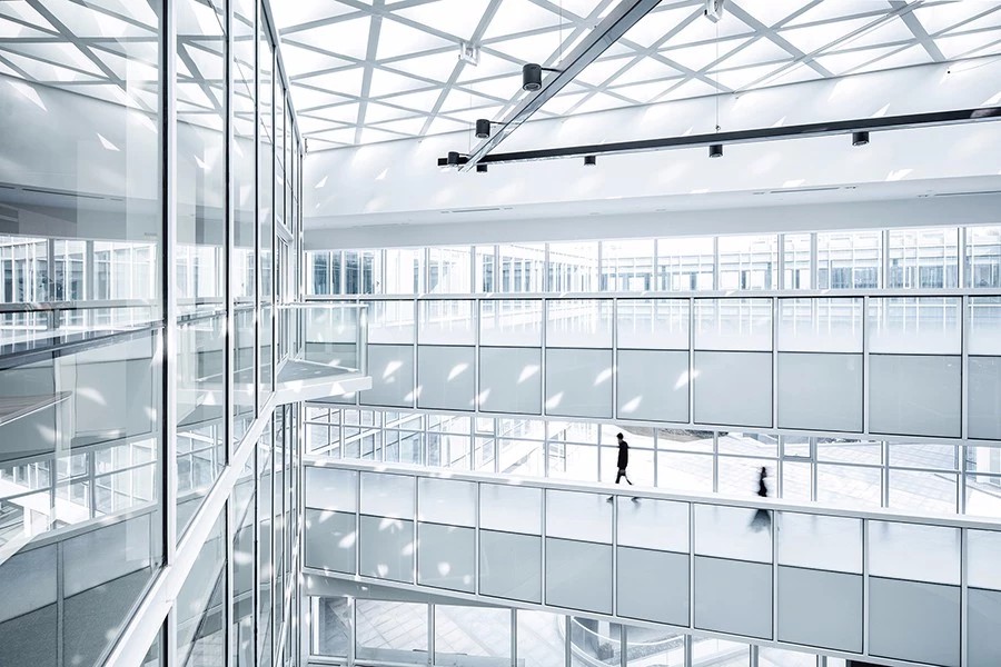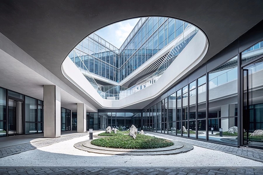 入口大堂是顶部有采光的四层通高空间,连着一部分会议室和展厅。设计以营造一个充满阳光与生命力的室内庭院为概念,围绕中庭空间设置了5条“巷道”,将一个大的平面空间分为6个由会议室、展厅和绿植围合成的空间小单元,每个巷道的尽端对着建筑的GRC窗户单元,将户外景观映入到室内空间。