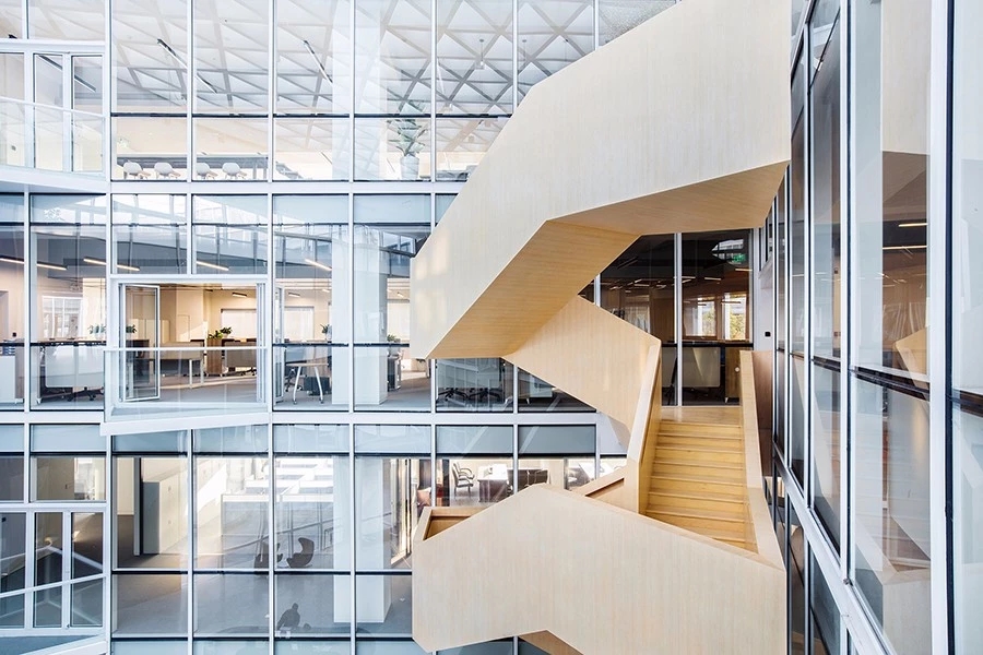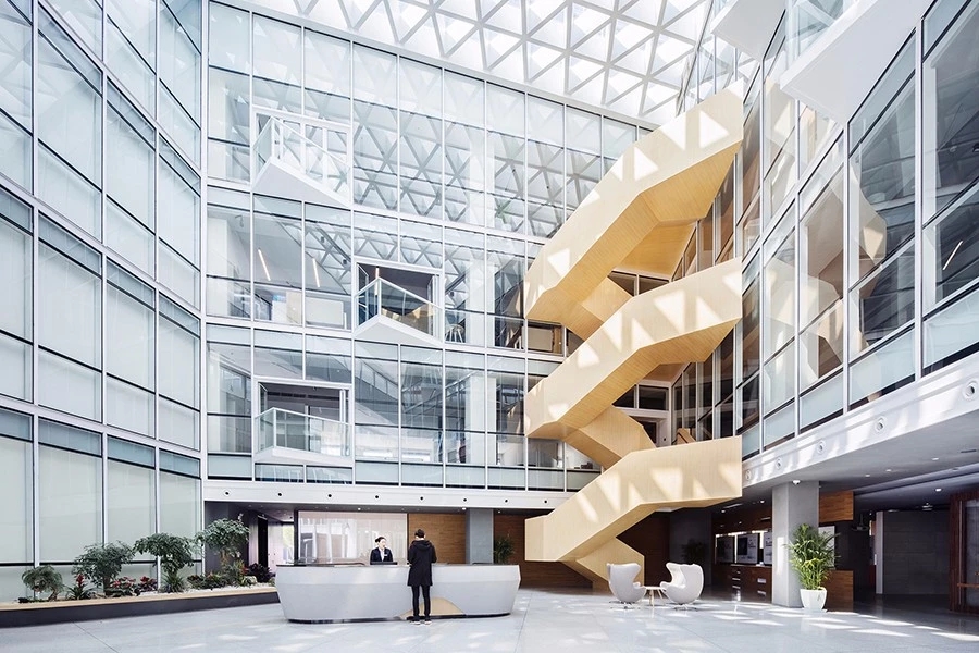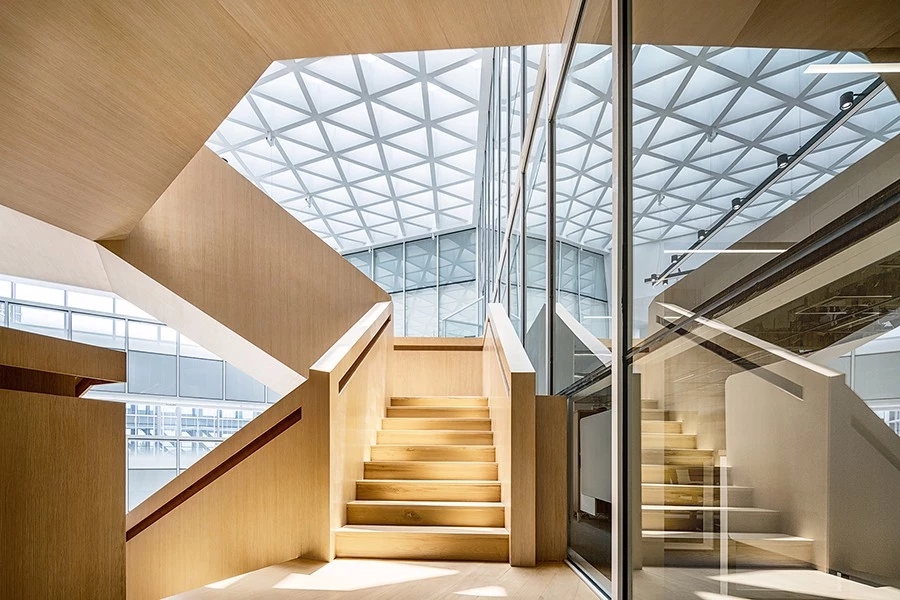 中庭通高空间三个界面使用透明玻璃,每层间隔着悬挑三角形露台,员工可以在工作之余小步走到露台上休憩。结合位于中庭两侧的绿色树木和花草,阳光从顶部三角形网格采光顶照下来,创造了中庭里仿佛置身于充满活力的室外庭院的体验。这些原本在室外的元素被引入室内,模糊了室内外的边界,室内设计也结合在了整体的建筑之美中。