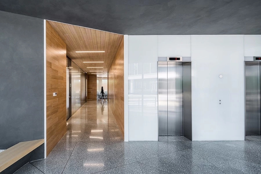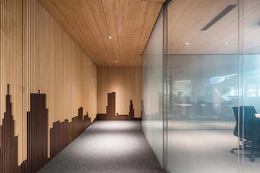 公共走道的区域,用以现代感强的深灰色作为主色调,而在会议室相对私密的走道用木质材质为主,形成了空间的包裹感受,对不同区域空间进行了区分。