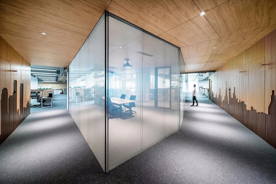 会议区域的界面,通电玻璃成为隔断的最佳选择。该材料通电时呈透明状态,断电的状态下呈现灰白不透明的磨砂效果。这样既保证了采光及空间内视觉的统一性,又给使用者提供了极大的便利。
