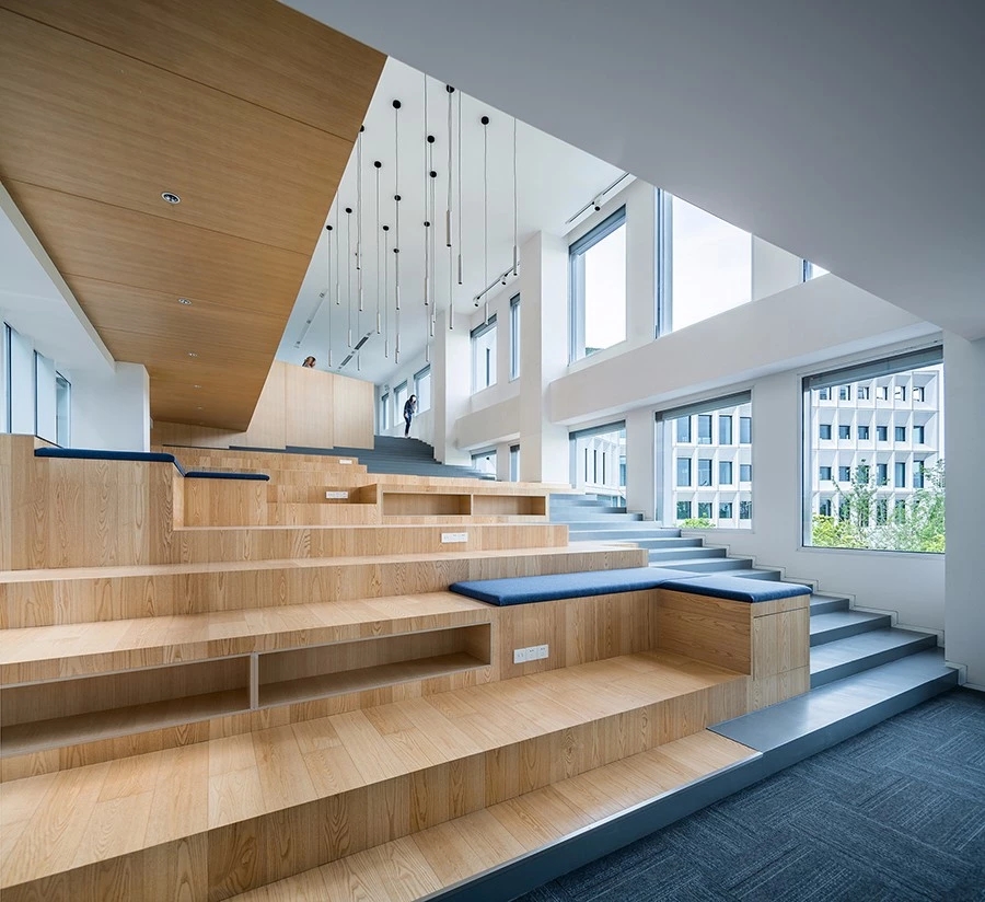 办公层会议区的公共走道的墙面以两种不同的颜色木饰面组合成抽象的上海城市天际线,高低错落。这种两种材料拼接的方式同样用于办公层大台阶的休息空间,大台阶的地面是木地板与水泥自流平的错位拼接,给员工塑造了一个集阅读、休憩与活动的场地。