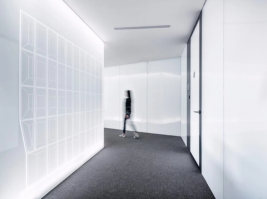 办公室公共走道的空间基调较之为开敞明亮,以白色为主基调,一侧为白色烤漆玻璃,另一侧将外立面图刻印在烤漆玻璃面上、内部打光后立面线条清晰的展现出来,塑造了富有未来感的空间。