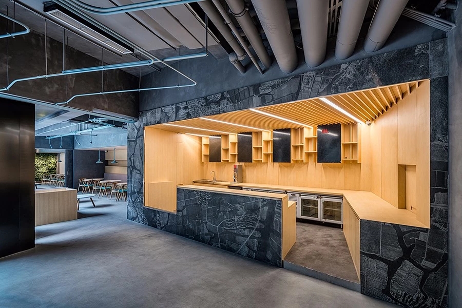 咖啡馆中间区域是吧台和卡座区,颇有工业感的成像混凝土包裹了吧台备餐空间,吧台内部为木饰面形成空间嵌套感;卡座区域用温暖的木饰面限定空间,沿窗设置休闲区并配以可移动家具,增加可组合搭配的效果。咖啡馆最里侧是“百变心情”区域,这是个非常灵活的供员工使用的空间,靠墙一侧设置可移动屏幕,对面一侧是台阶作为与涂鸦墙,靠边一侧是员工睡眠舱,这是一个给员工活动、讨论、午休的充满温馨感的专属区域。