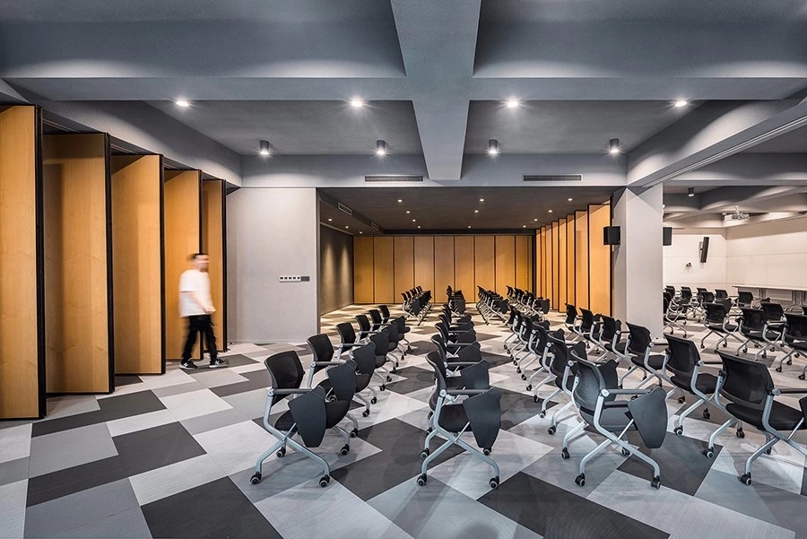 多功能厅基于建筑的大空间,一面墙设置为白色烤漆玻璃和投影面,另外三个面和中央通过可旋转和平移的隔断设置,可以根据使用行为划分出不同的空间状态:隔断全都打开的时候是开敞的无柱大空间,方便全体员工的活动和会议;隔断全都关闭的时候空间被分为四个可以独立使用的小空间,进行培训、讨论等活动。隔断之间的软橡胶垫细节设计可以增强空间分开之后的隔音效果,而多功能厅的椅子是可移动和折叠式,便于不同使用时候的转换。