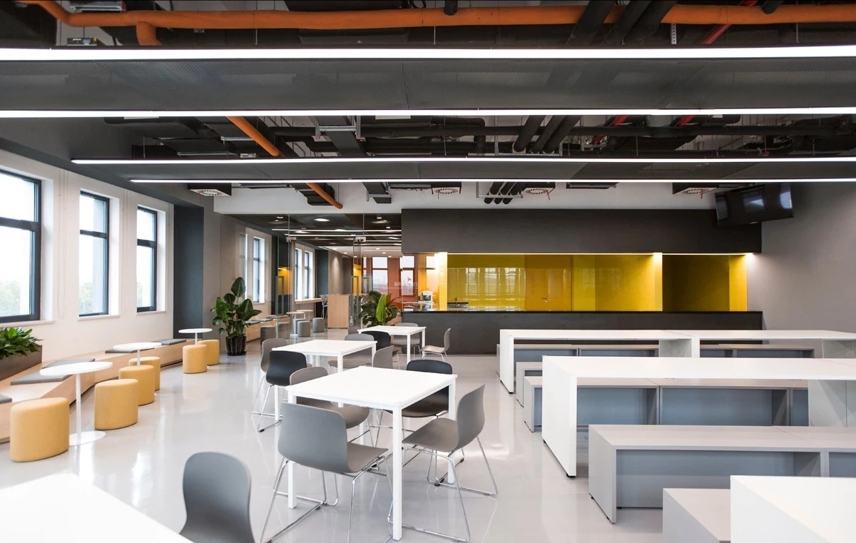 位于二层的咖啡吧与餐厅设计体现了工厂的元素与文化,大餐桌与长板凳的使用易于员工在就餐时进行交流。方形餐吧台布局可以有效的疏导人流动线。