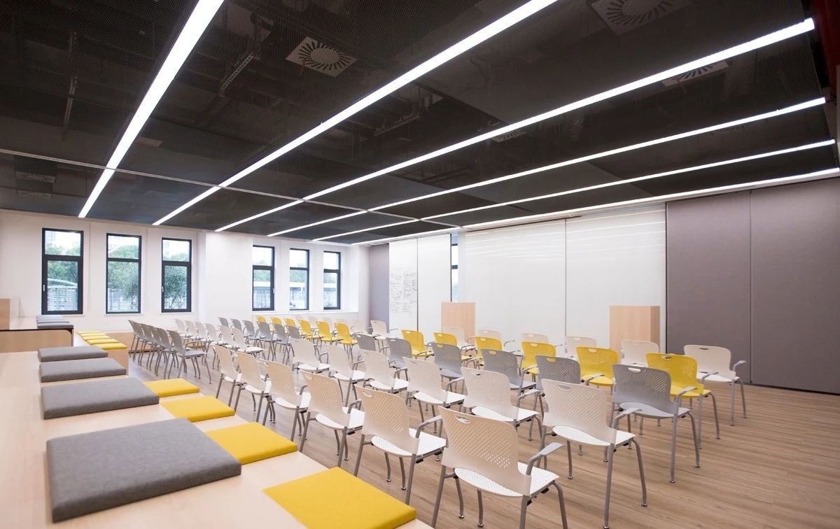 在一层,培训室通过引入中间的活动隔断,实现了可以体验高度灵活性和适应性的空间,将大培训室分隔成两个有滑动书写白板系统的中型房间。为了最大限度地提高使用灵活性,在房间的后部提供了长阶梯式长椅,可堆叠的椅子可以存储在长椅座位下的抽屉中。