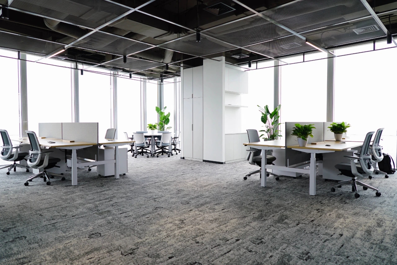Open office decorated with high end, featured carpet flooring, recalling the idea of some concrete flooring of contmporary lofts. The flexible arrangement of open desks helps to create a wellbeing environment where employees feel cared for.