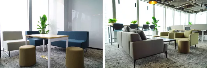 Some resting areas are situated closer to the working area, but they are also secluded for select private conversations.