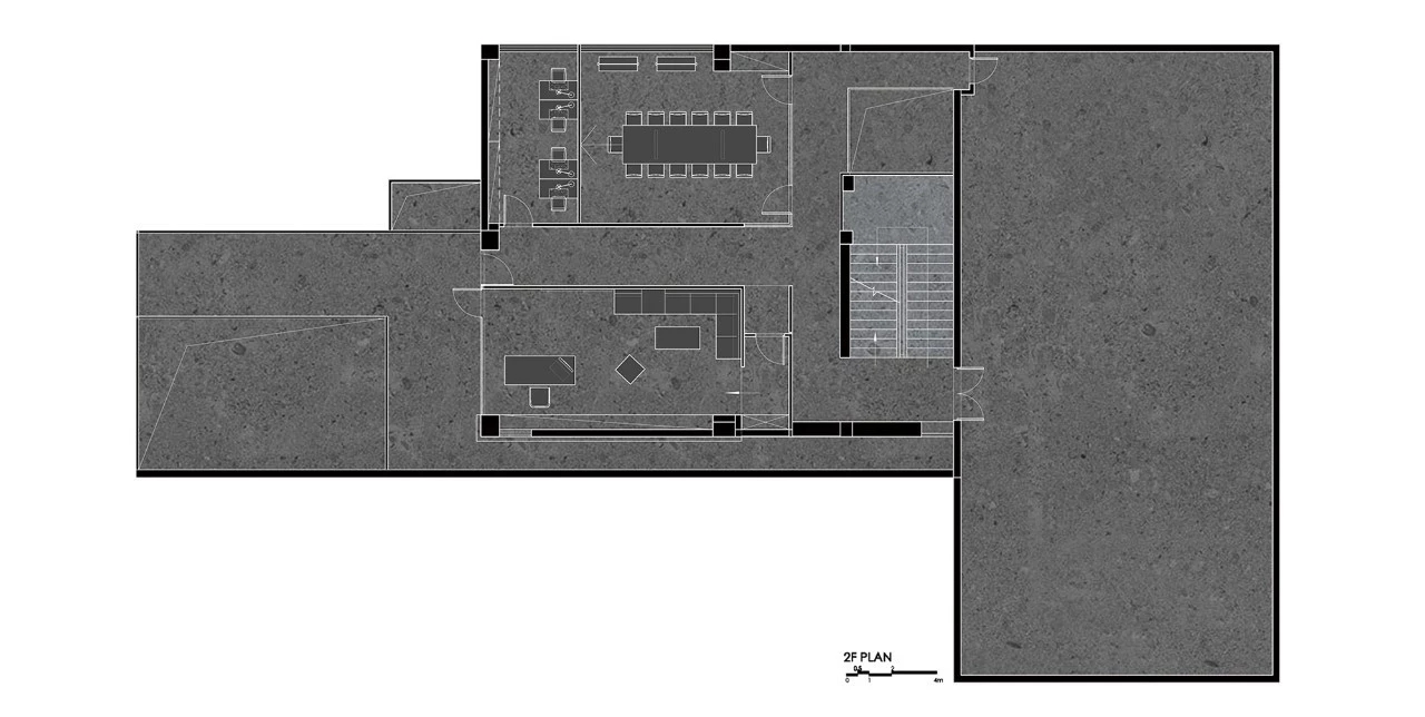 将二十年前的灰白楼梯稍加翻新,用简洁的大理石板穿过楼梯。楼梯侧前方的前台与侧后方的休闲水吧区串联成 L型,一直延伸到楼梯后的中空。前台、茶水间、操作台、洽谈区被串联起来,形成趣味的流动体,同时又拉近人与人之间沟通交流的距离。