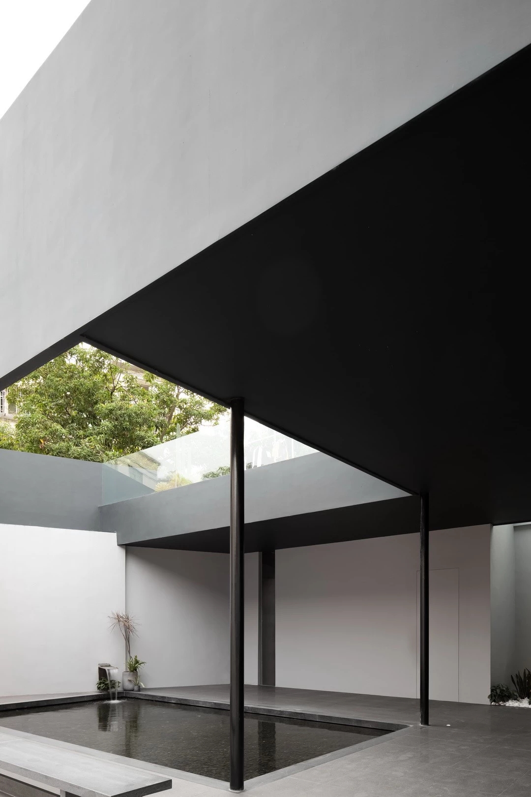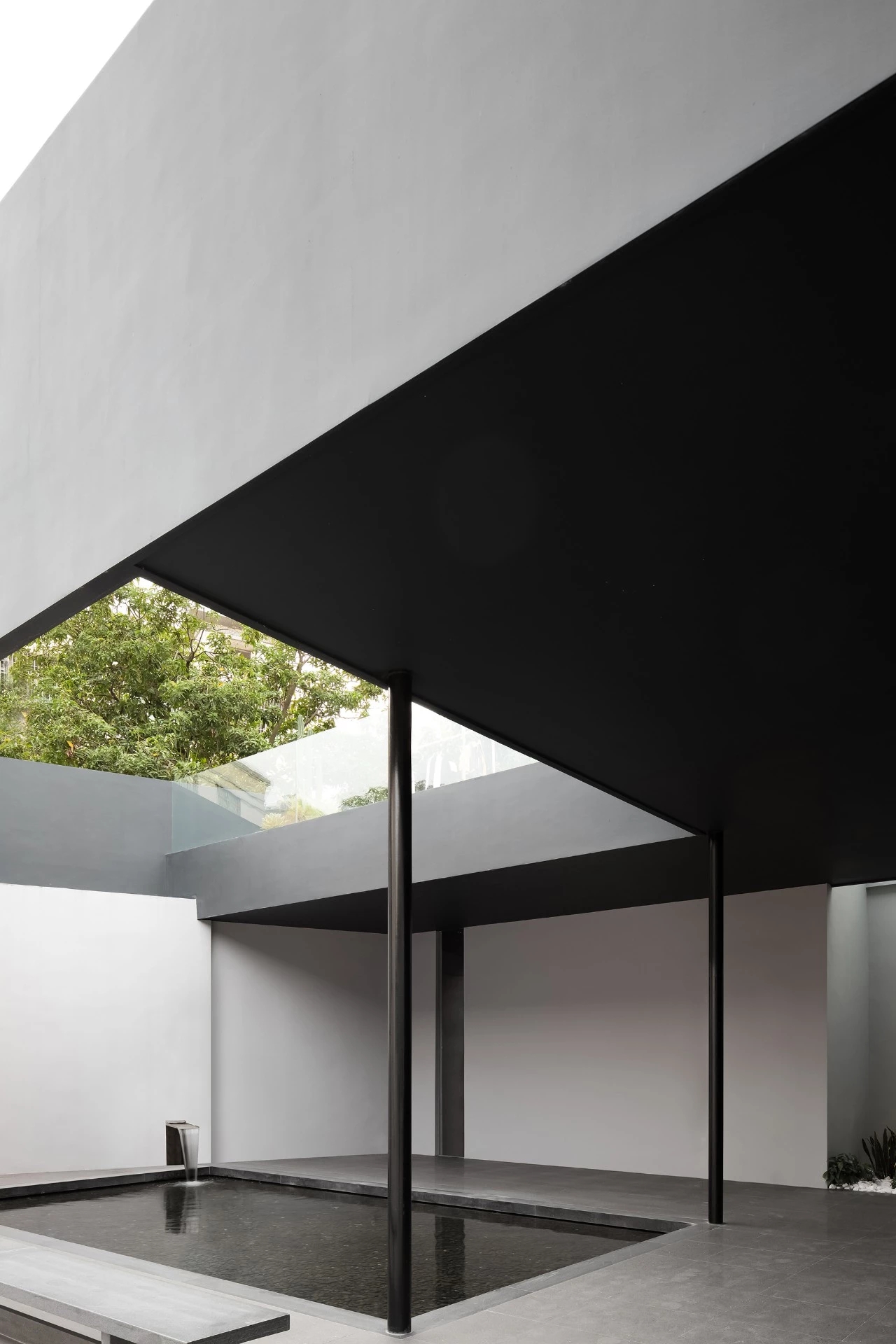 方形的水池之上,从墙外引流的流水喷泉汩汩涌入,动静有序。零星绿植点缀其间,矩形灰石凳呼应水池的直线条,一石一木皆成风景。适度留白的简洁色调,线条利落的建筑,整个画面盈缺妥恰,给人以舒缓和治愈。