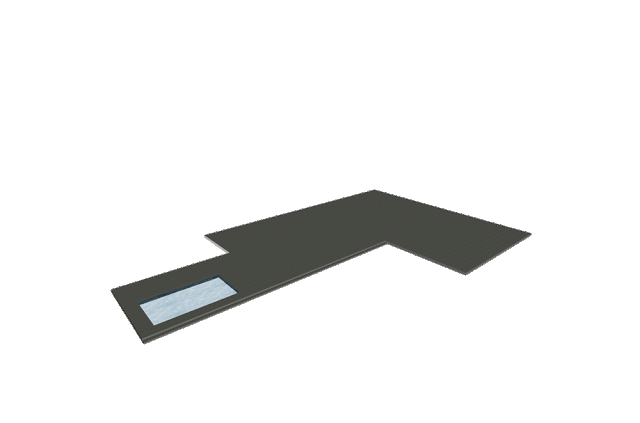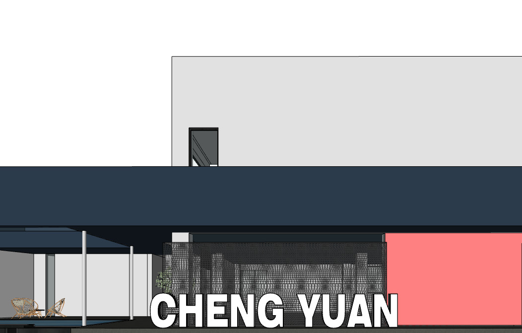 一层的入口与水池之间隔着 L 型走道,在此上方加建成二层的 L 型露台,也把一层的走道变成了景观廊道。露台的围栏和底板与入口室内的天花颜色一致,同时形成有体量感的建筑体块, 拉长了视觉纵深感。