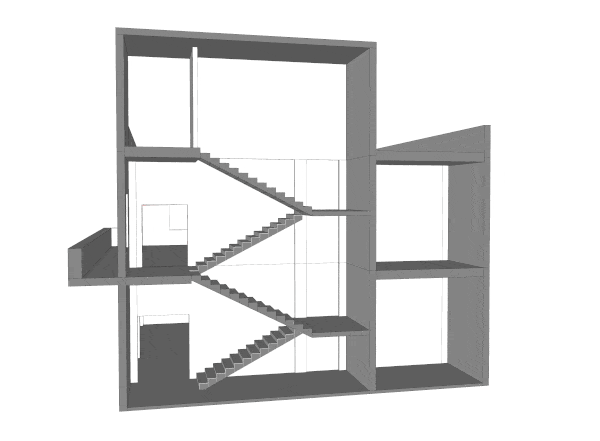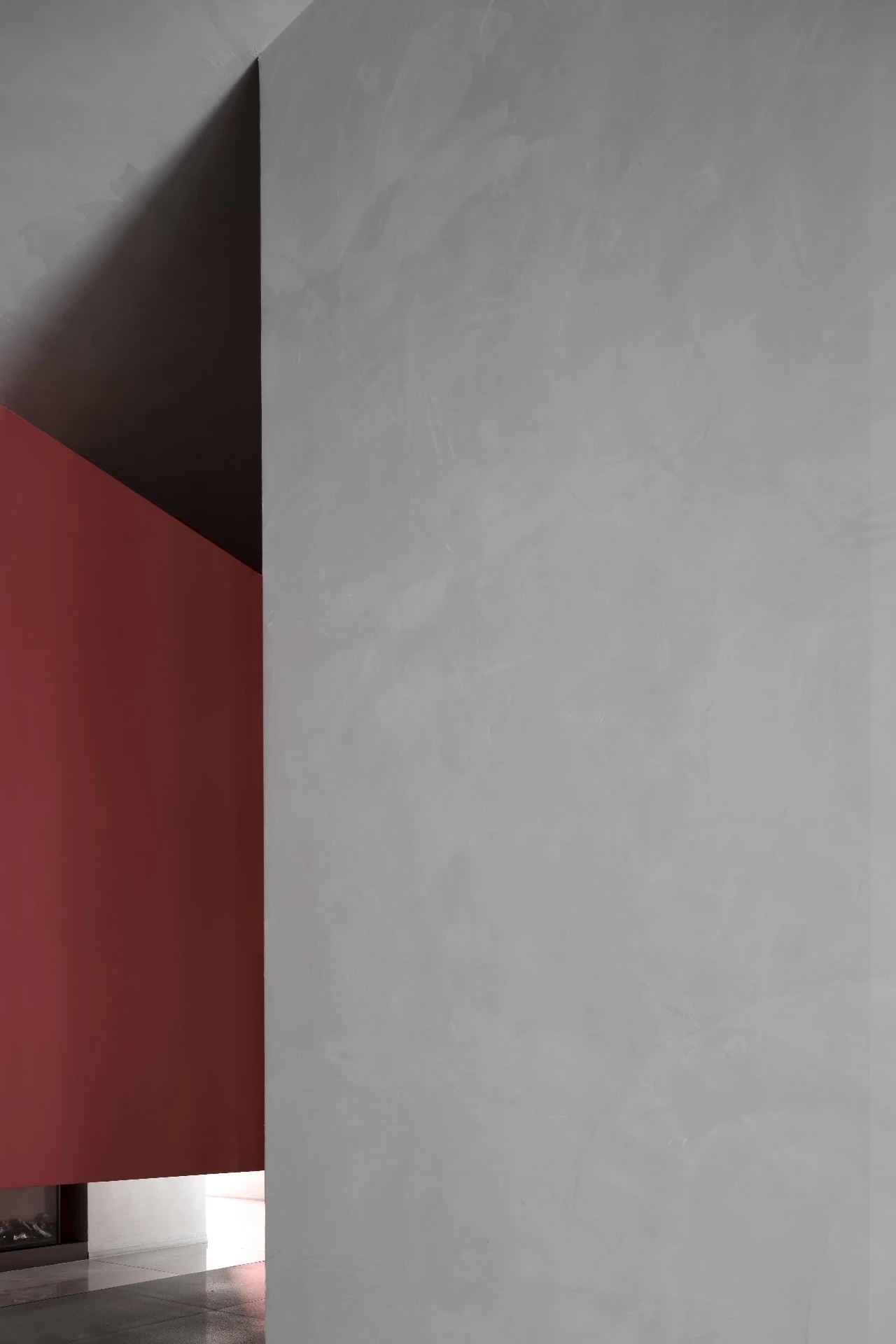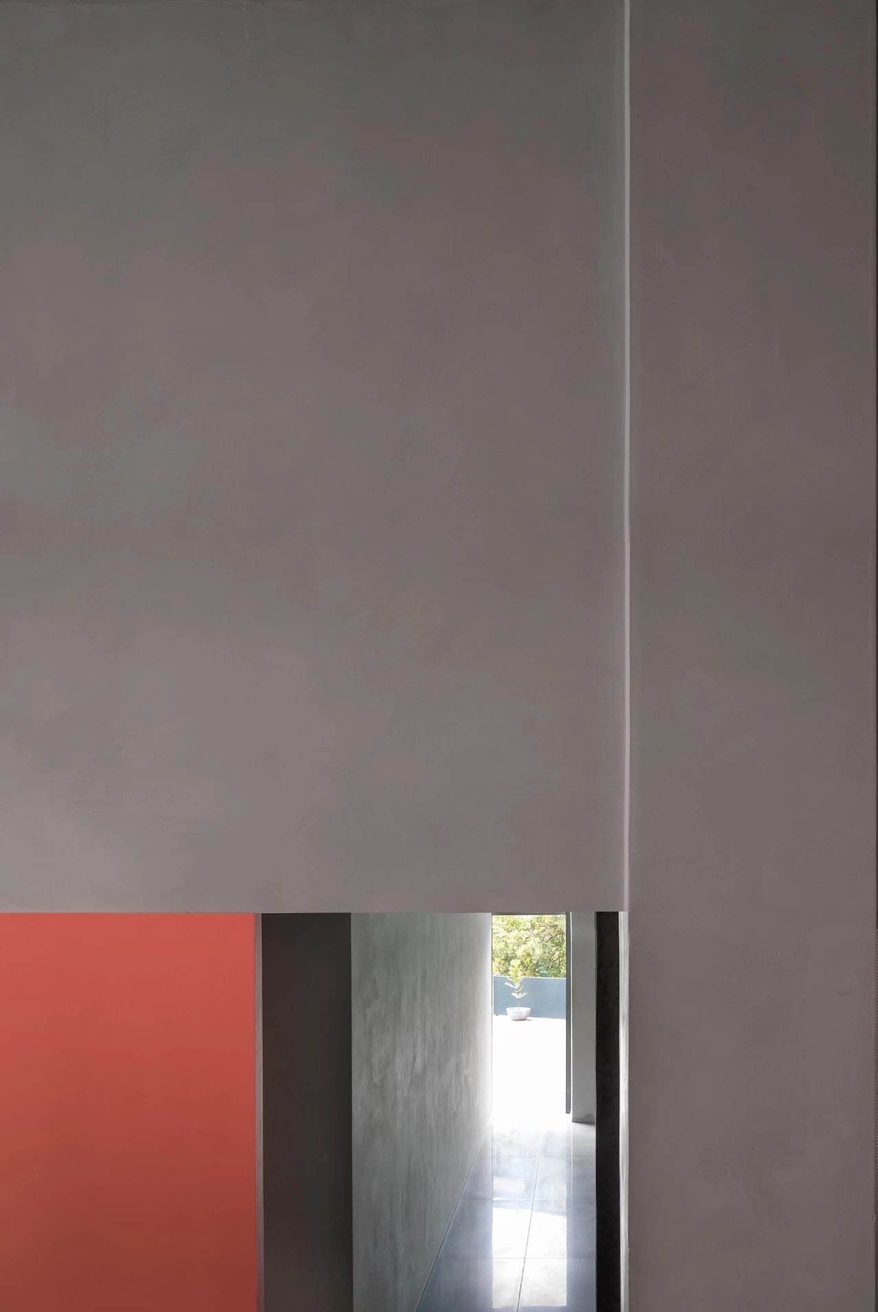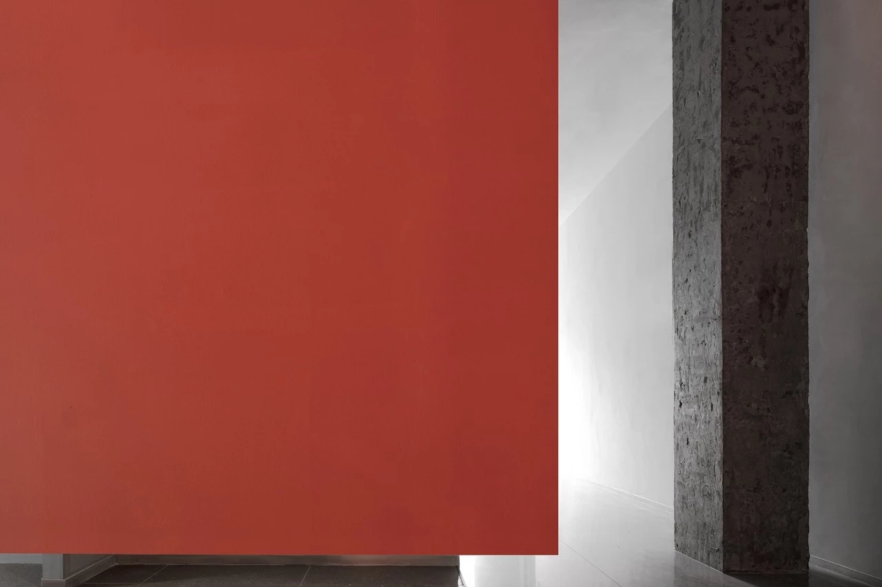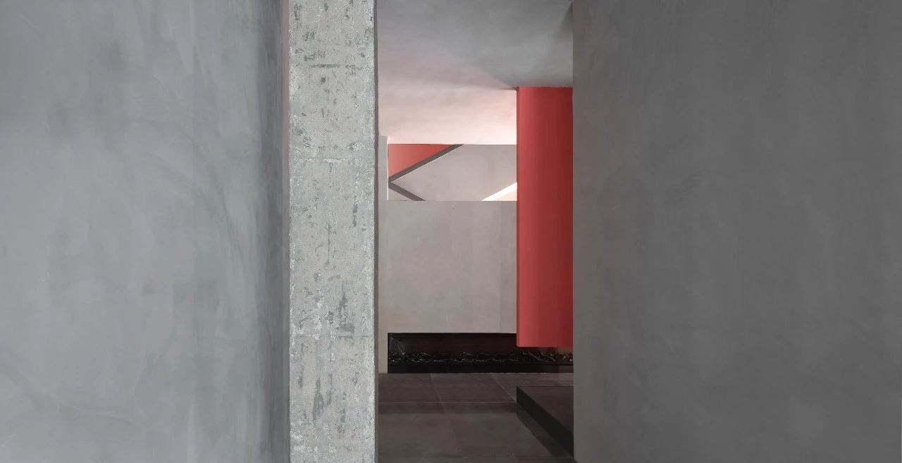 楼梯和中空区域的墙立面采用与建筑外立面颜色相同的珊瑚红涂料,使得室外建筑感延伸至室内,模糊了室内外的界限。