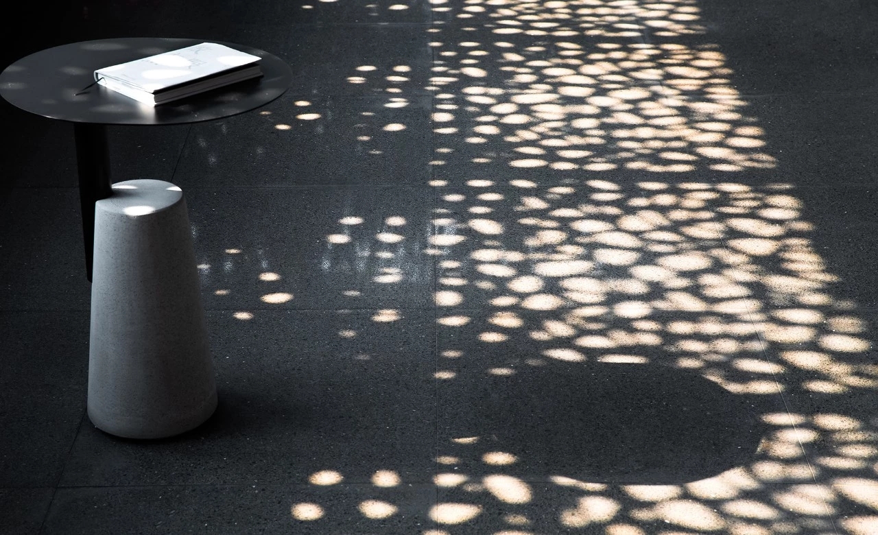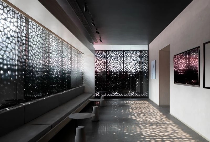 靠近前台的公共洽谈区,将原本的外墙拆除,用镂空铝板替代。由下至上,镂空眼由小到大,自然渐变。阳光透过镂空钻进室内,在白墙和地面投下斑驳光影,犹如盛开的繁花。冬季,室内太阳光斑的位置转移变换更加明显,让室内满溢着暖意与温度。
