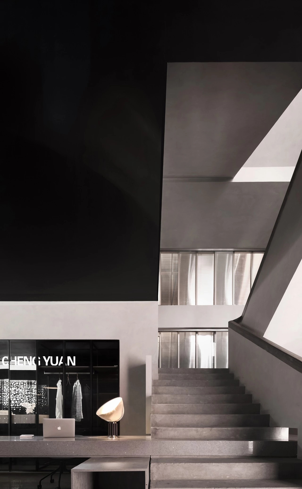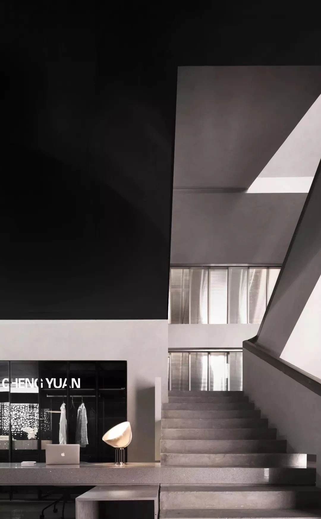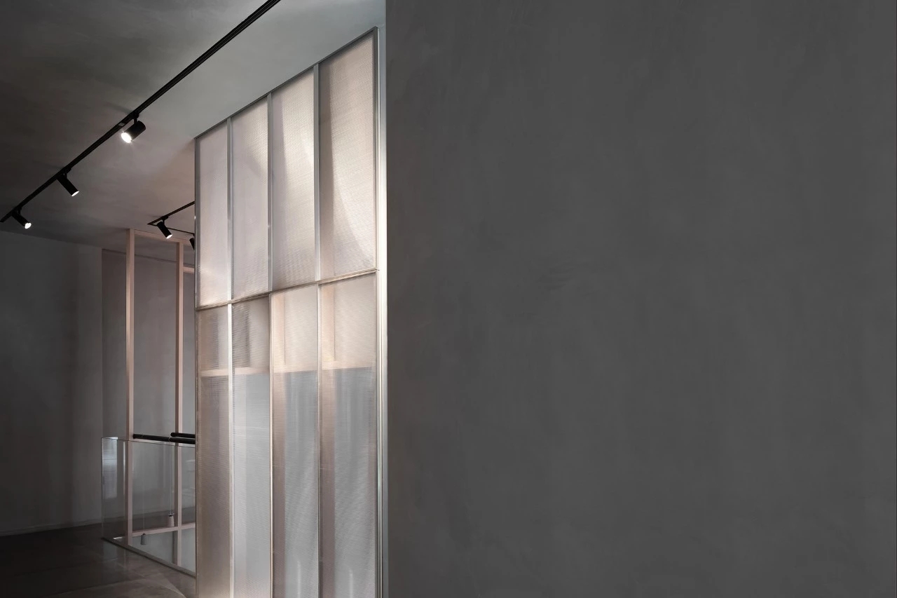 为了呼应布料材质的朦胧感,设计师在墙身及楼梯选用卡布隆阳光板扣住主题。