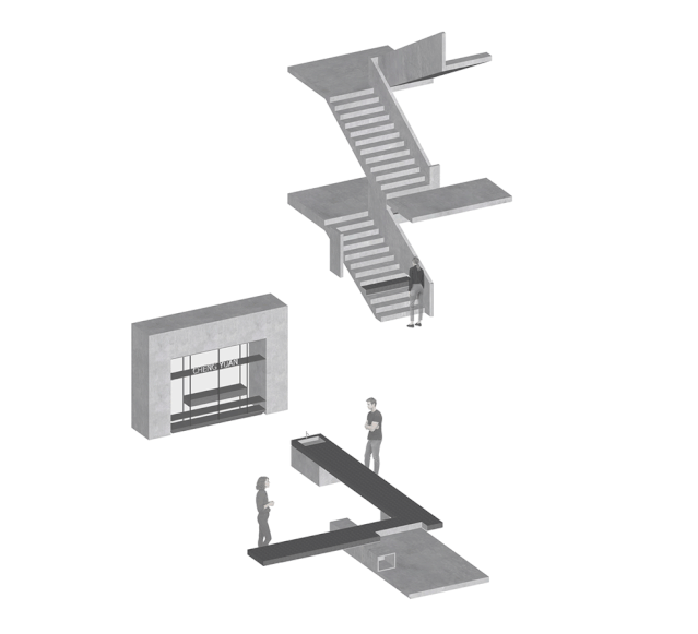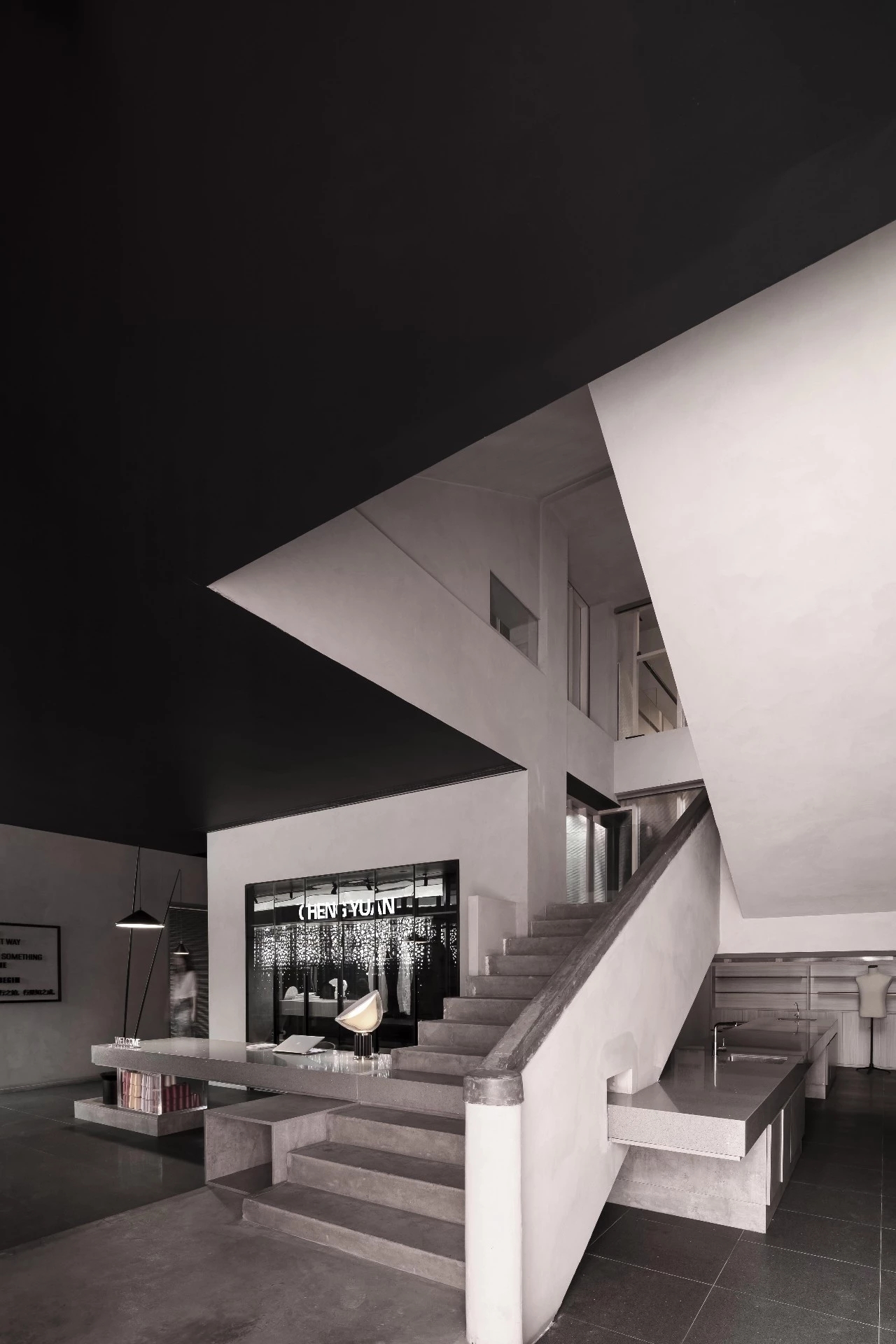 在深化上我们要重点考虑前台台面受力问题,通过现场丈量步级的高度并结合人体工程确定台面高度。而令整体空间比较新颖之处,是我们选用了30mm厚的亚克力板作为受力支撑,结合缝纫线团高度调整台面与亚克力的整体比例。台面与楼梯之间以凹缝细节收口,美观的同时也能避免石材与原楼梯水泥面的缝隙衔接缺陷。