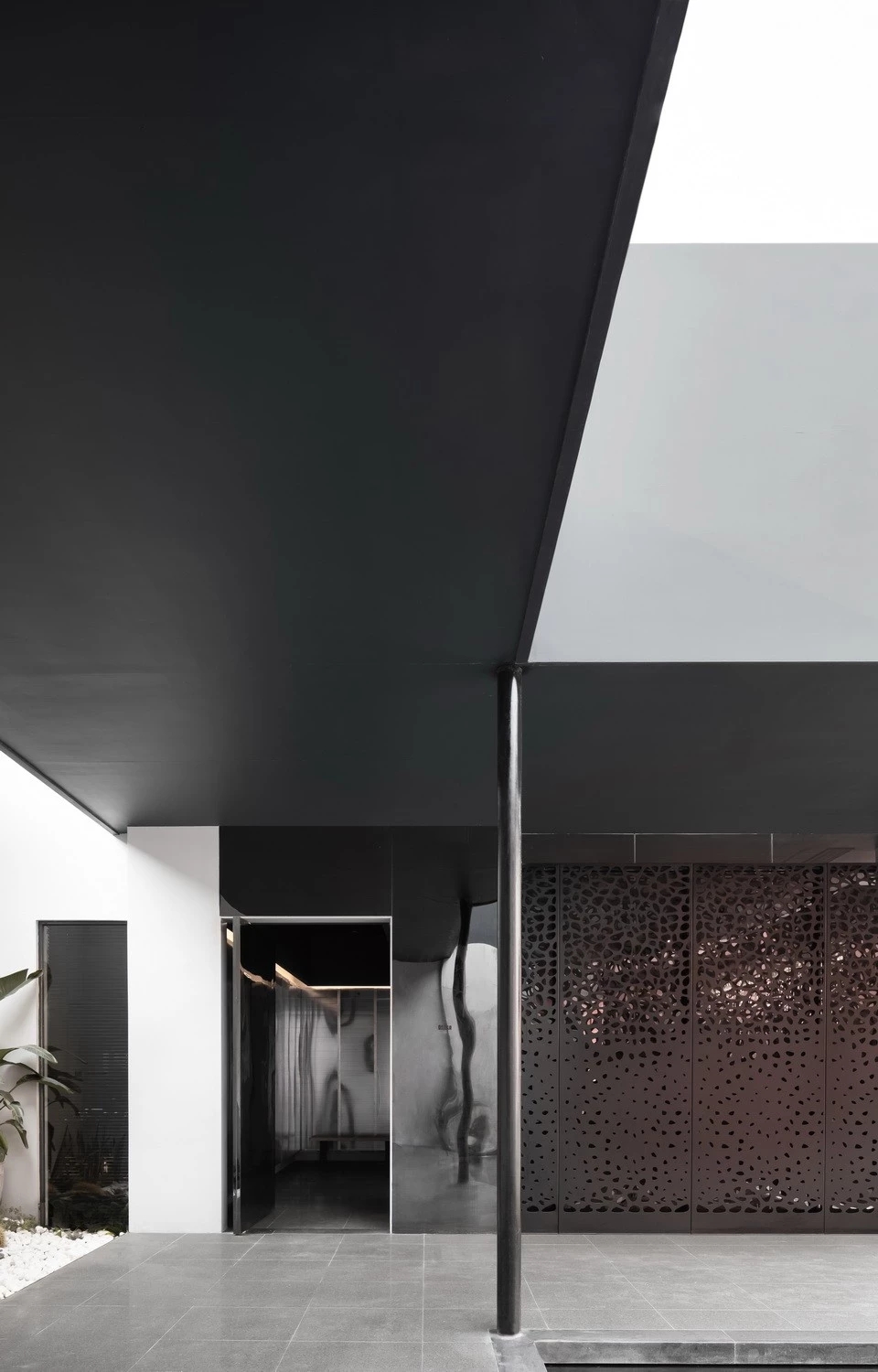 L型露台外侧,黑色钢板从建筑主体一直延伸到水池尽头,与L型露台闭合,拼成一个“回”字。原建筑、新建的露台和水池构成一个整体,显现一气呵成的建筑美感,外观与气质也契合国际美学时尚。