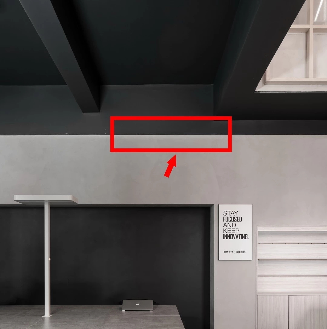 因涉及空间过大,板材尺寸不足以覆盖全部面,且市面上暂时没有合适的安装件,也出于成本考虑,所以我们利用木纹铝通衔接两块板材,在四周交接收边,需要我们和施工人员共同协商,将不锈钢现场折边做出一个全新的收口构件,最终也得到不错效果。