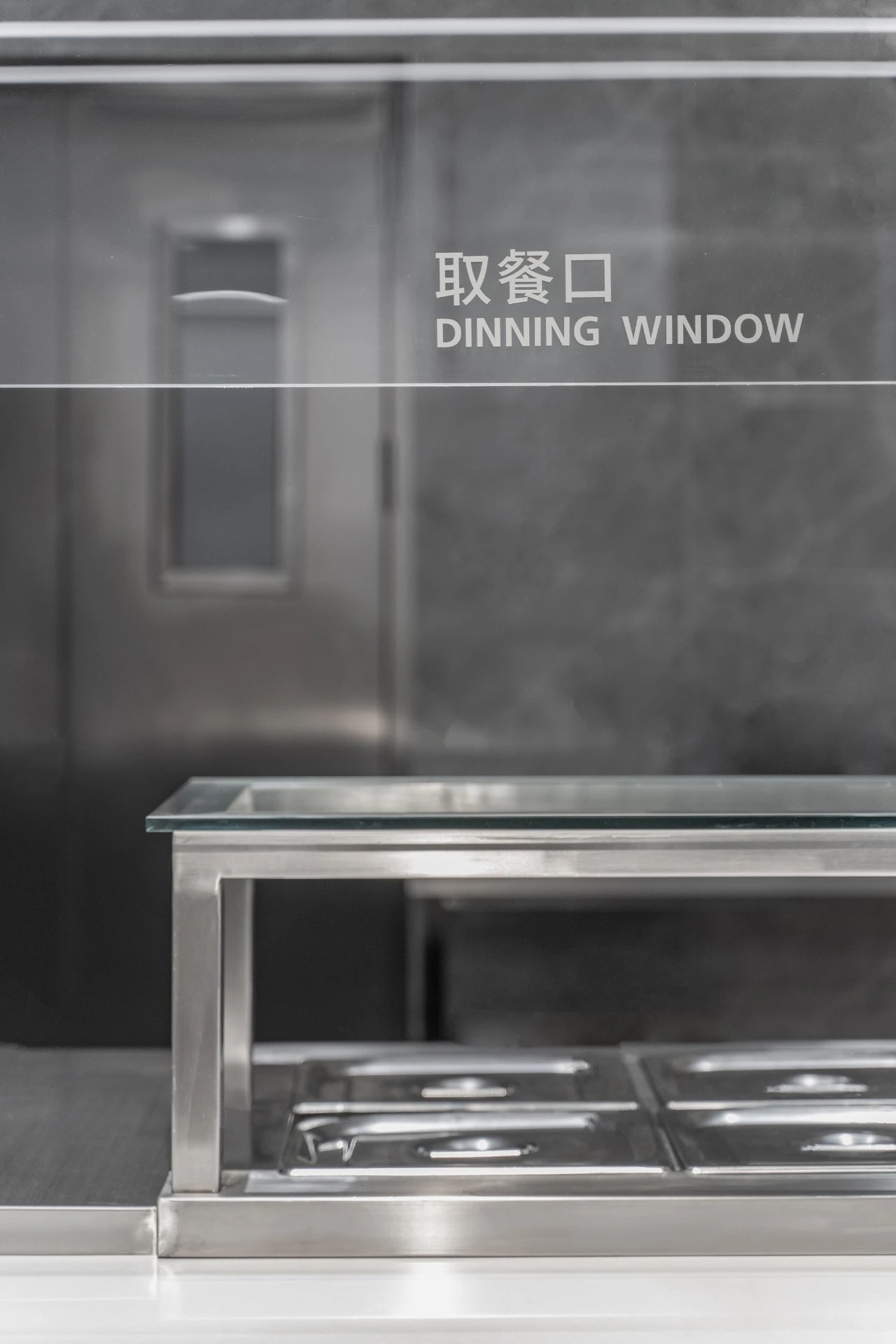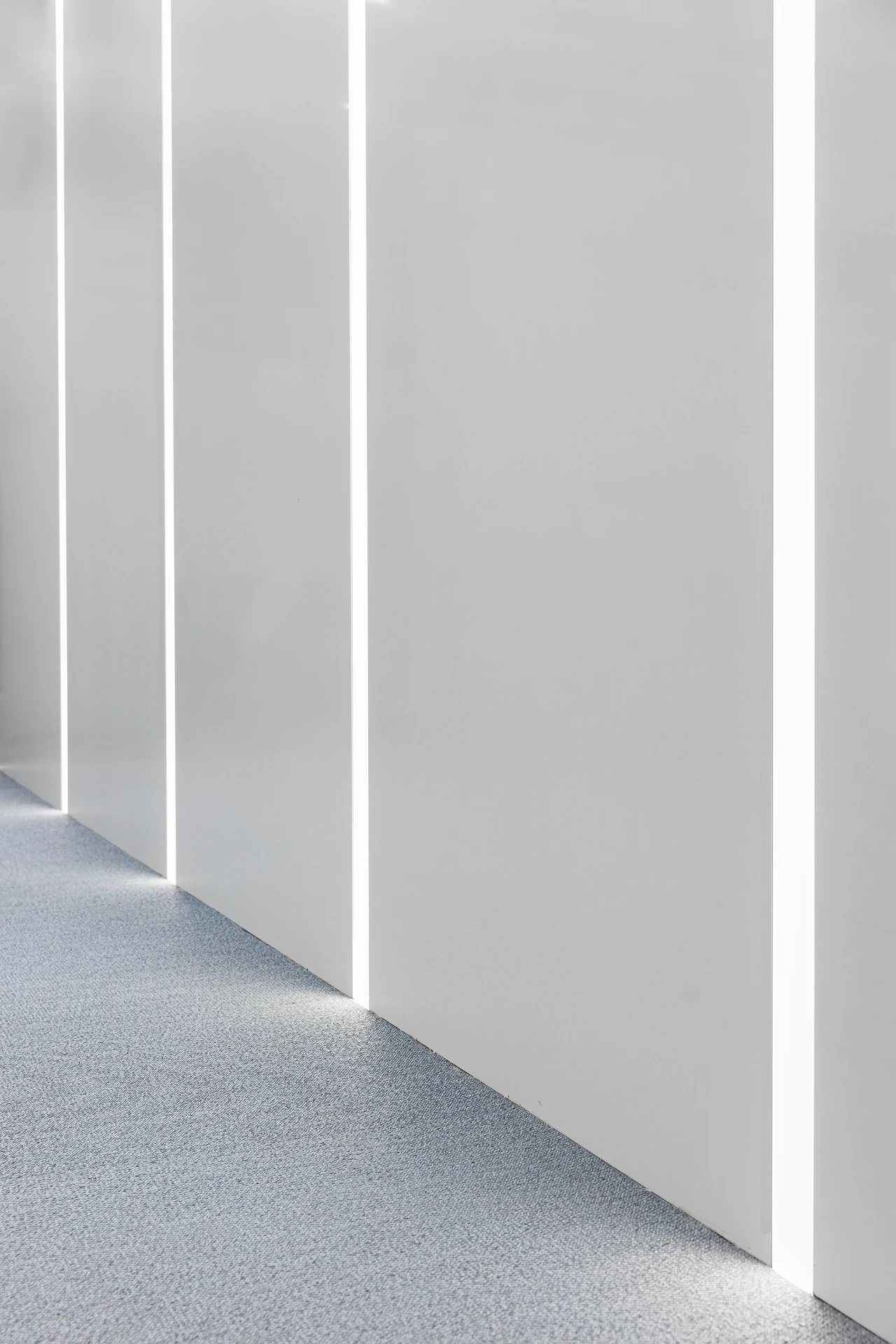 ▼走廊背景为灰色背漆玻璃,顶部细长的灯带增加纵深感