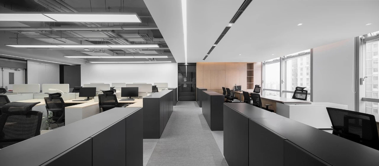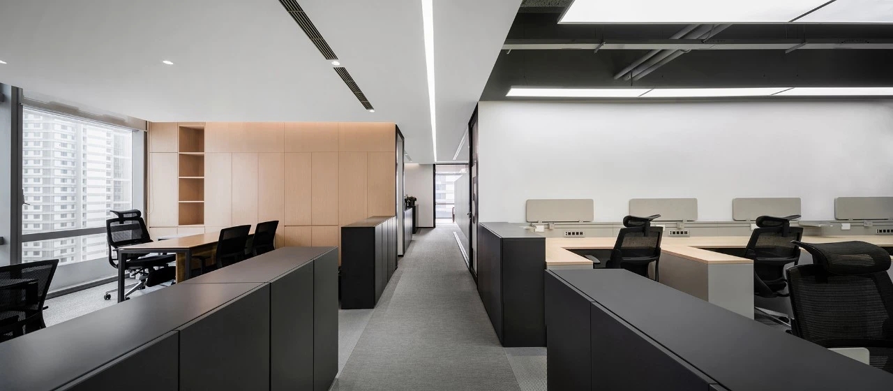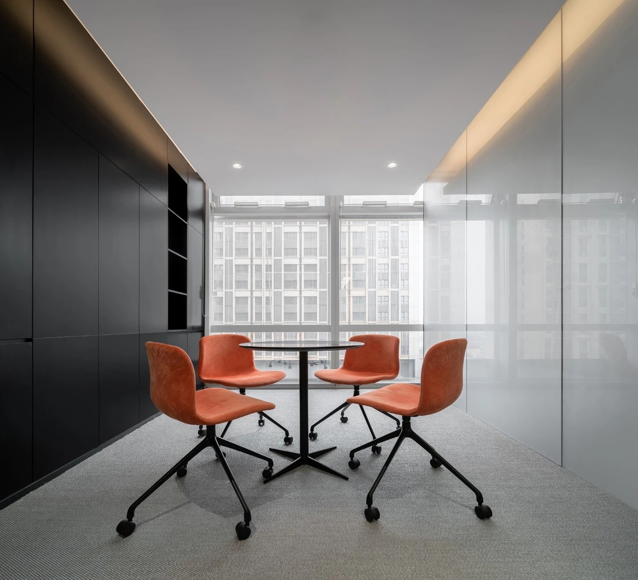 我们用全新的思路反复推敲,将开敞办公区的吊顶局部裸露喷灰,重新梳理机电和管道路由,让其疏密有致。办公空间搭配银灰色背漆玻璃、银灰色地毯、原木色木饰面、深灰边框玻璃隔断等同色系材质,与白色石材、白色石膏板吊顶组成基础色调,局部嵌入橙色和洋红色,就像在空间中引入的微妙波动,每一帧都透露出独特的视觉信息,高品质的材质和高标准的施工细节与工艺是成为了项目的一大亮点。减法,让空间变得更丰富。