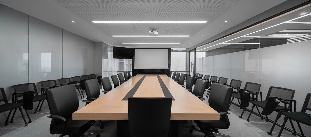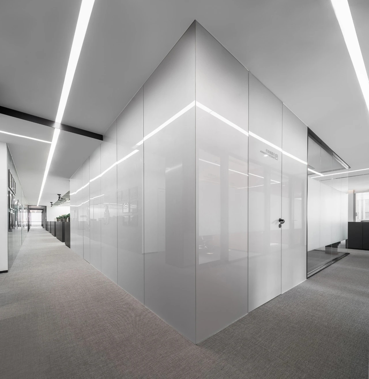 ▼会议室以银灰色背漆玻璃搭配银色地毯,玻璃上的竖条纹标识贴膜让会议室内部若隐若现,既保证隐私也保证了空间通透