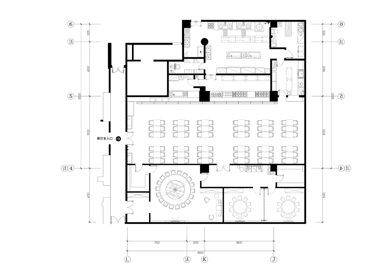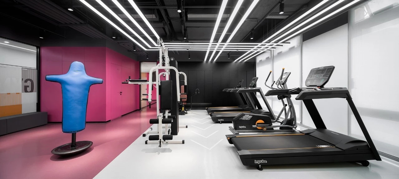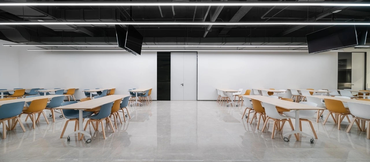 员工餐厅整体呈矩形,就餐区域中将餐桌以阵列的形式排布,协调一致、边界清晰,线形吊灯贯穿始终,延续办公区设计手法的同时,增加空间纵深感。原木色餐桌、明快跳跃的餐椅、缤纷的色彩,在有限的交往中让自由的思想互相碰撞,同时营造井然有序的用餐空间。