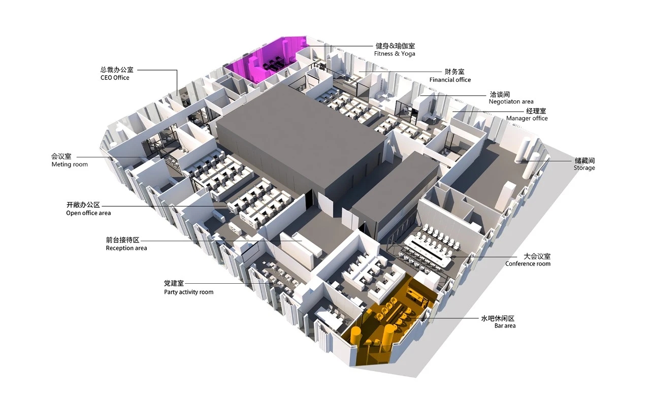 ▼共享休闲区嵌入橙色元素,让空间充满活力,打破办公的沉闷