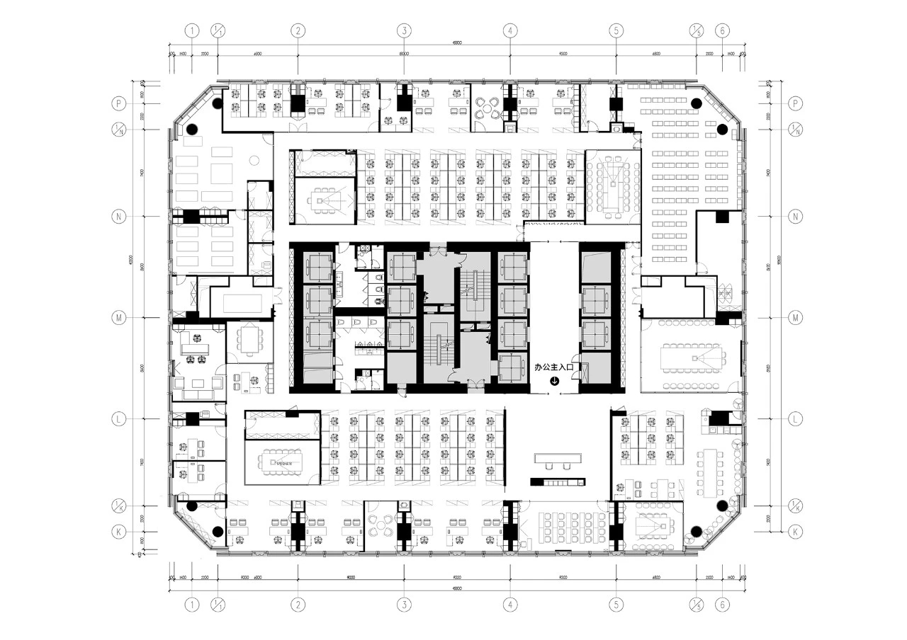 项目位于唐山市,办公区位于大楼的18层,配套的员工餐厅位于5层。这是一幢原始核心筒层高只有2.4米且建筑层高仅有2.6米的老式写字楼,去掉原始的装饰层后显露出最大的特点:核心筒的建筑结构和灰暗低矮的电梯厅入口,整个空间传统、暗淡、低矮。如何将如此平平无奇的空间变身简约商务的办公空间,是整个改造项目的核心。改造不在于用什么设计语言去表达全新的设计理念,而在于尽可能地摒弃一切不必要的手法,将空间原本的灵气尽情显现。
