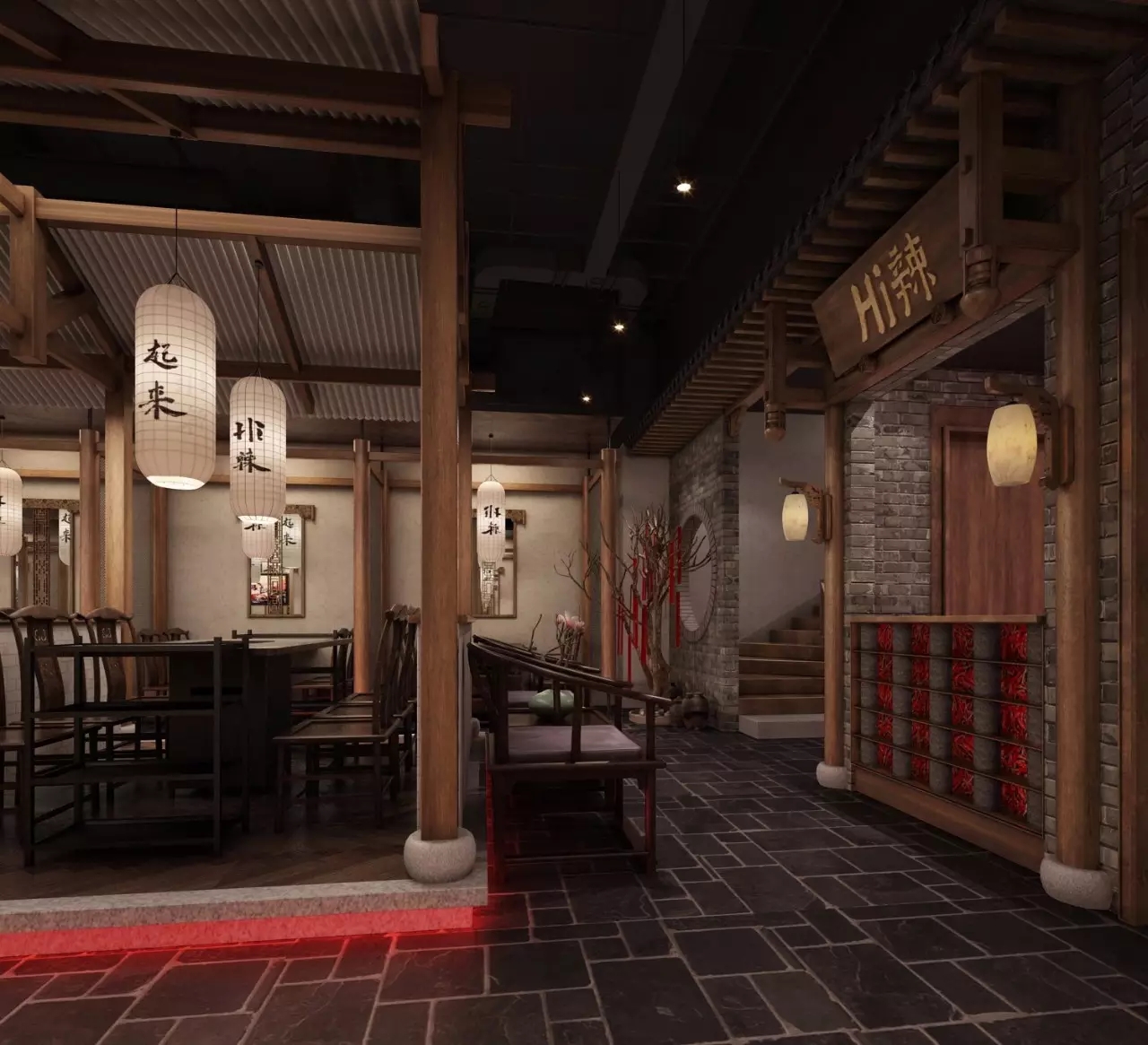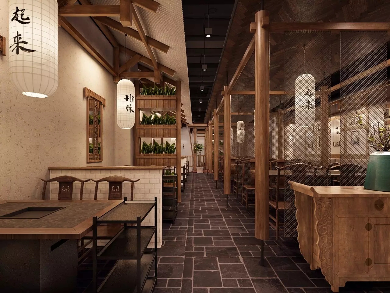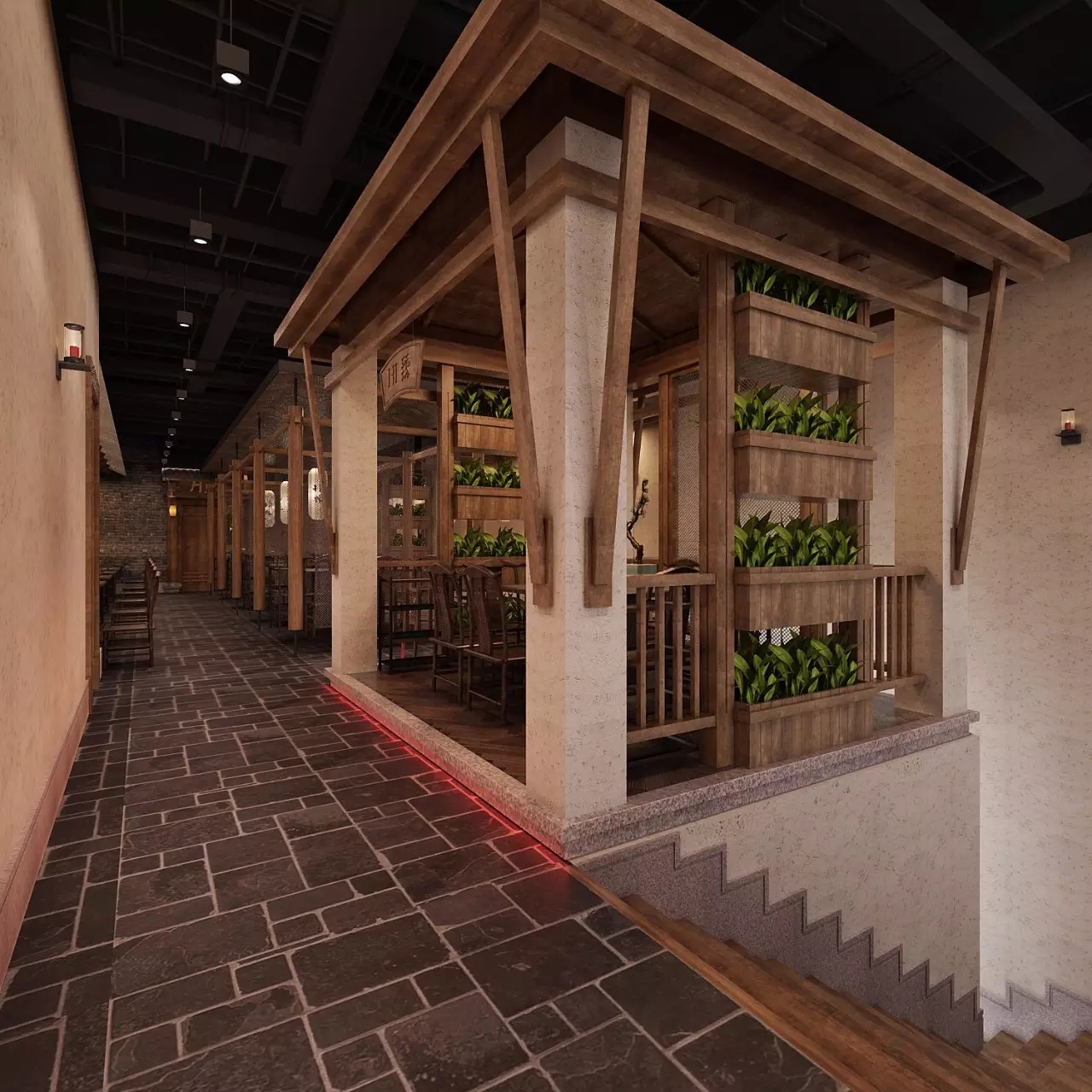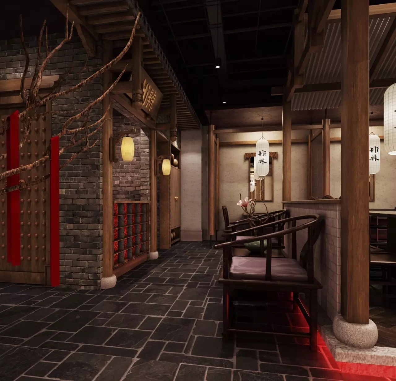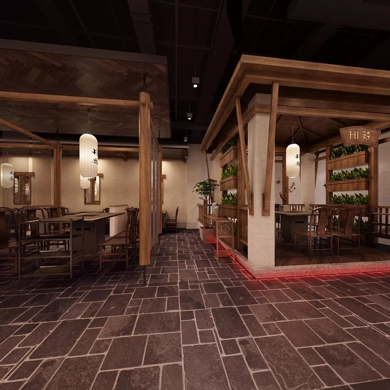 主要材料:青石板、老榆木、老船木、灰瓦、钢丝网垂帘、碳钢、芝麻白石材、金属波纹板、锈板