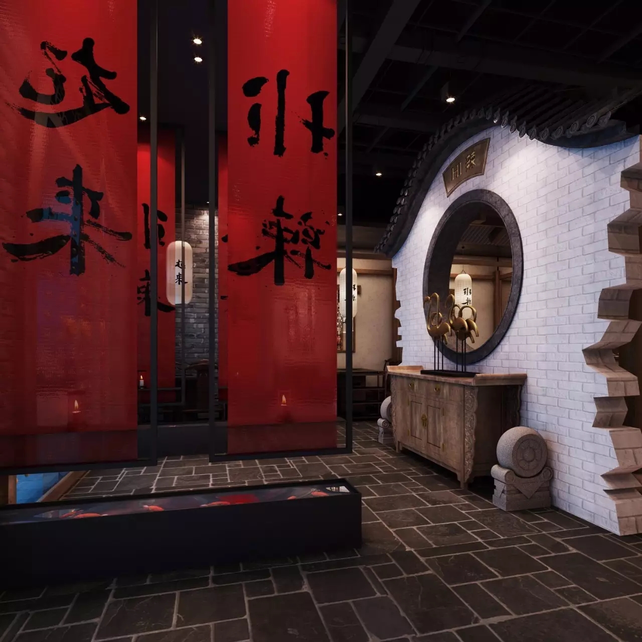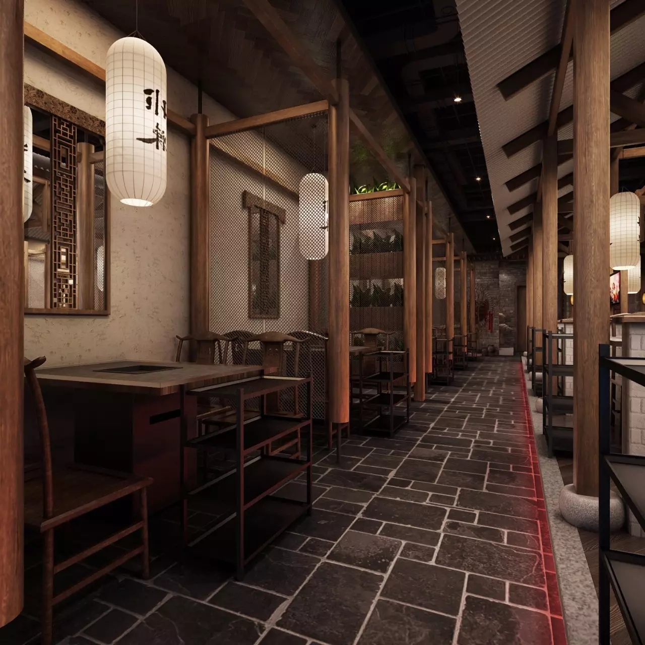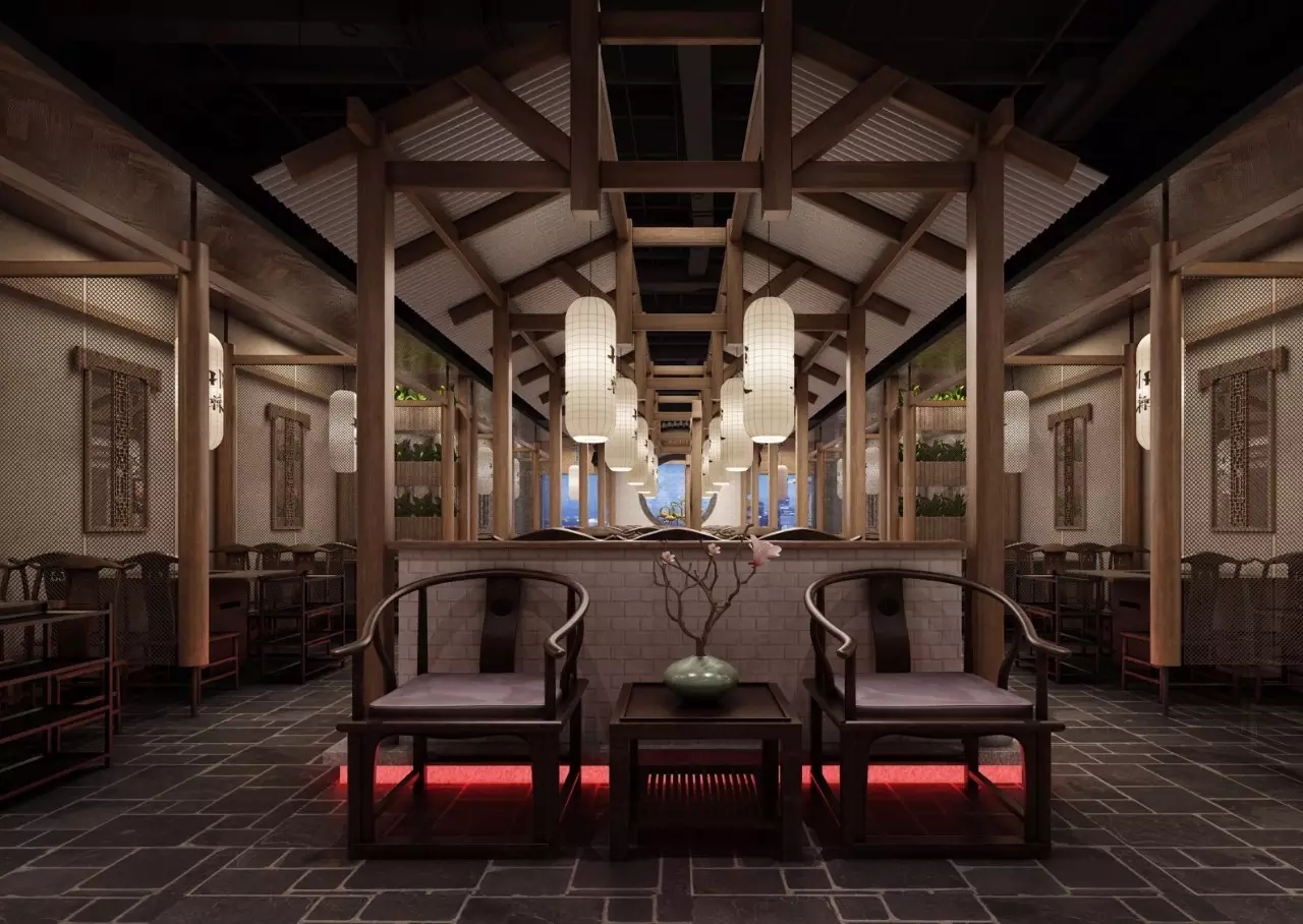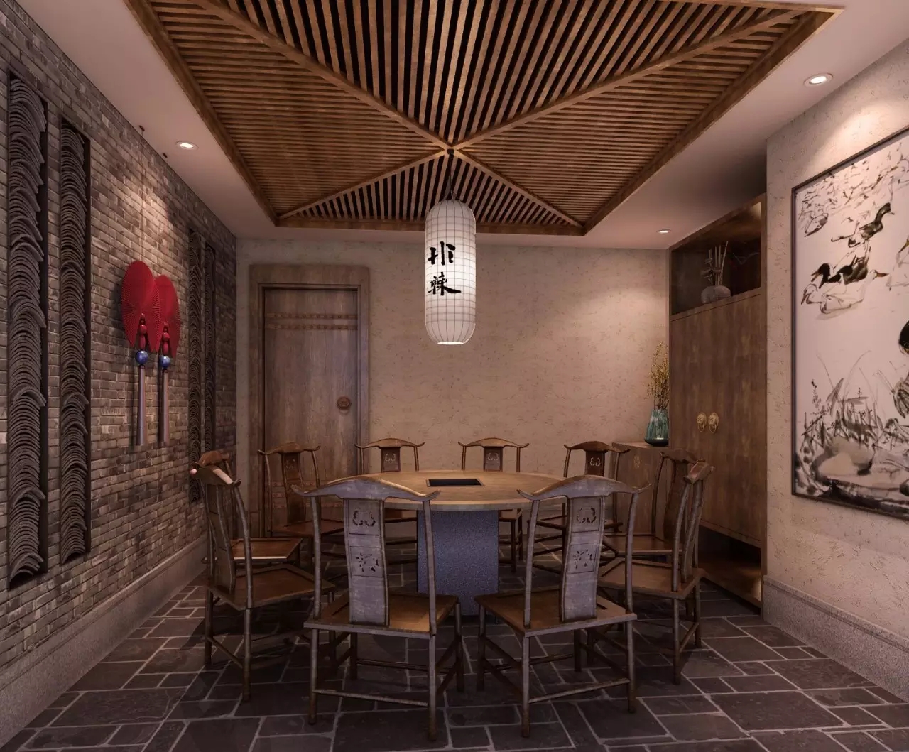 主要材料:青石板、老榆木、老船木、灰瓦、钢丝网垂帘、碳钢、芝麻白石材、金属波纹板、锈板
