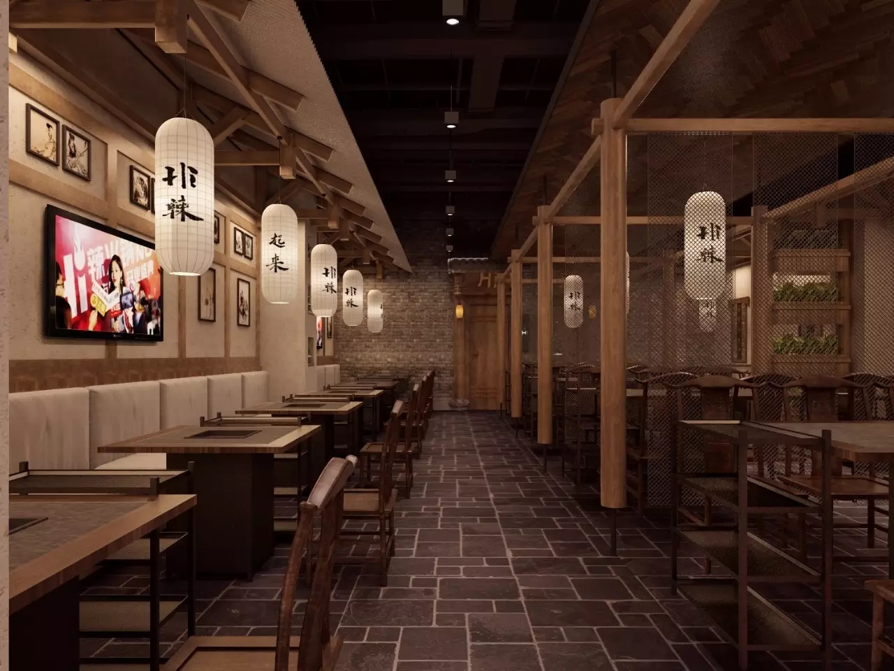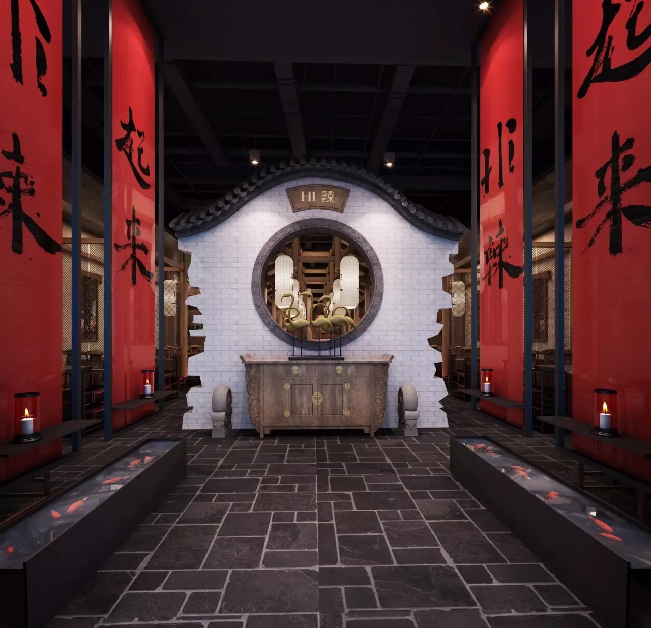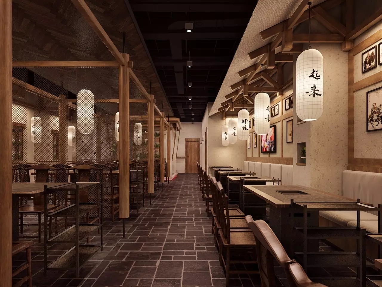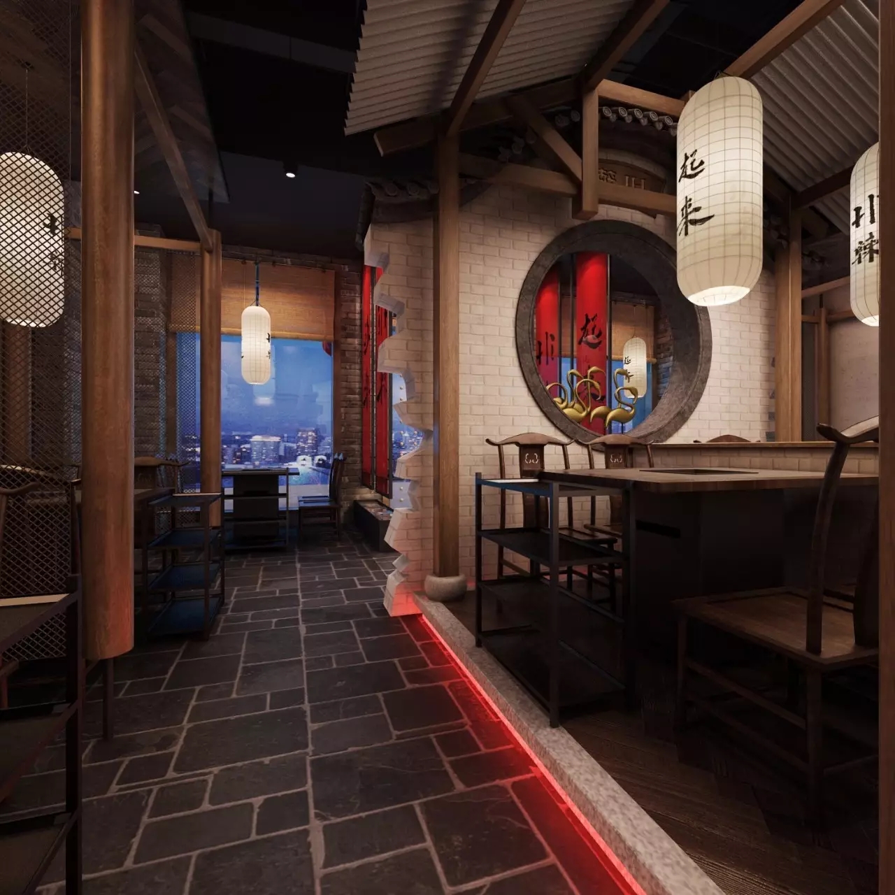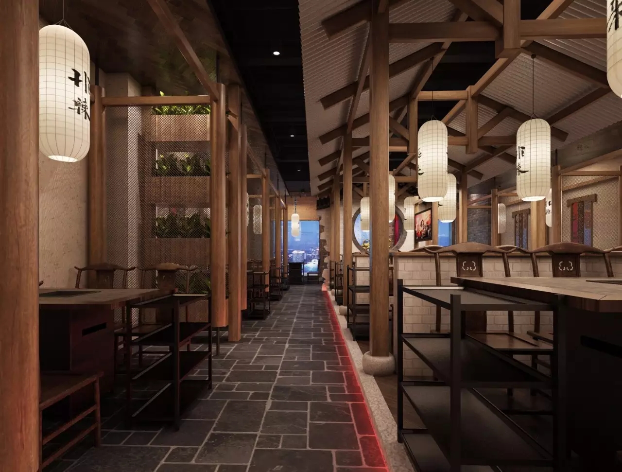 主要材料:青石板、老榆木、老船木、灰瓦、钢丝网垂帘、碳钢、芝麻白石材、金属波纹板、锈板