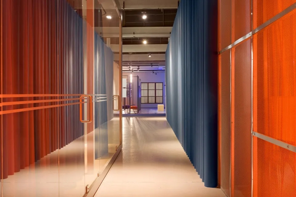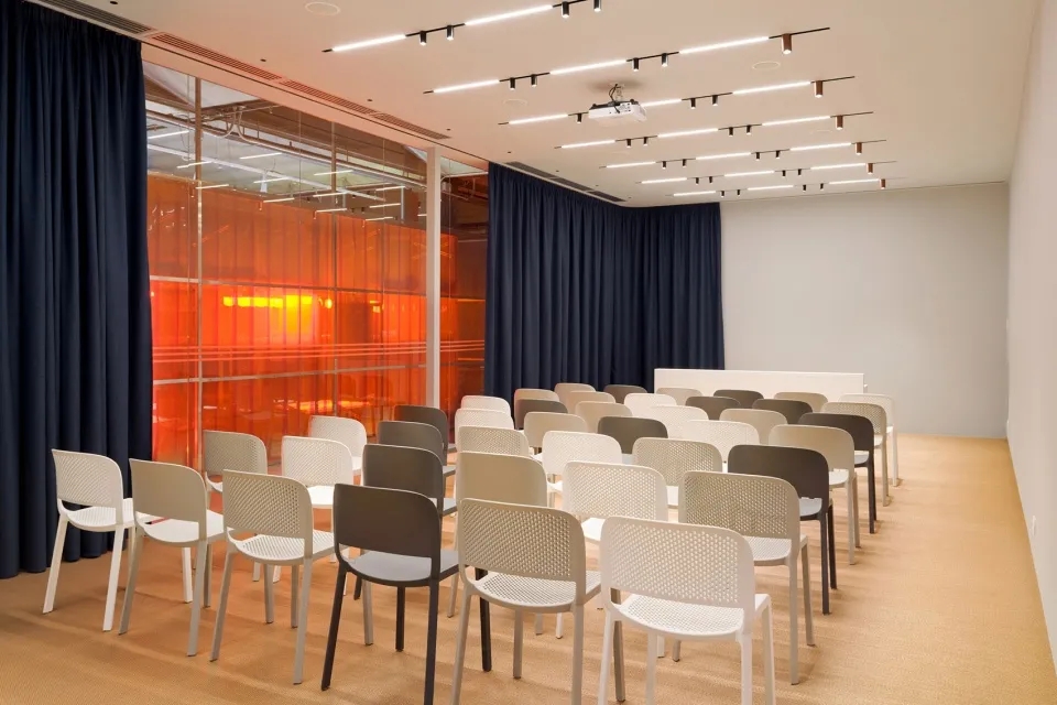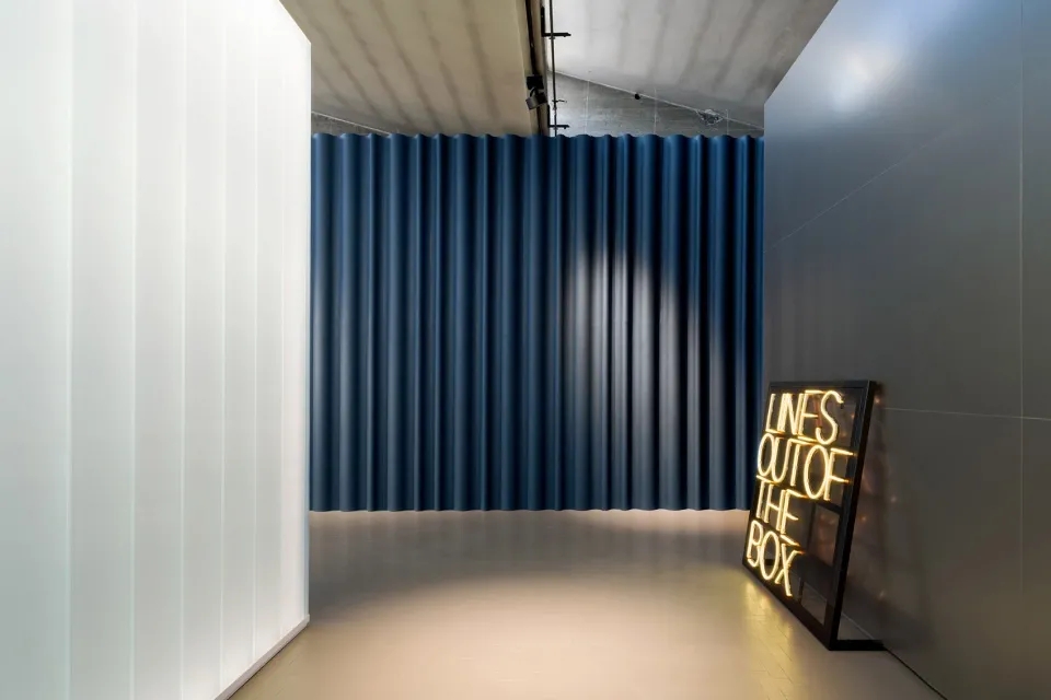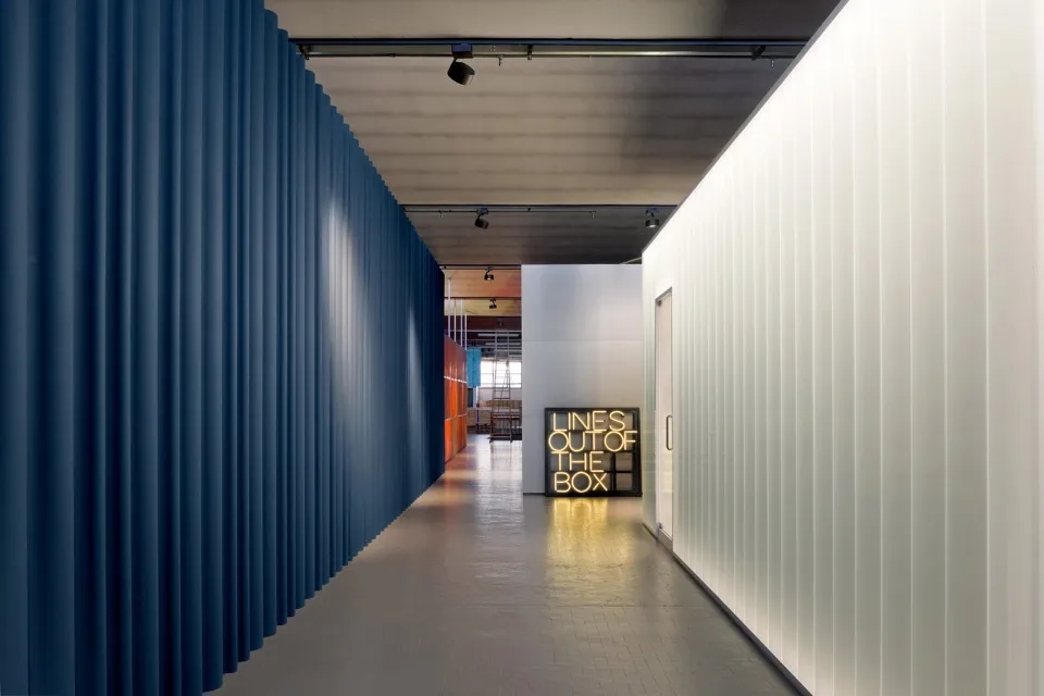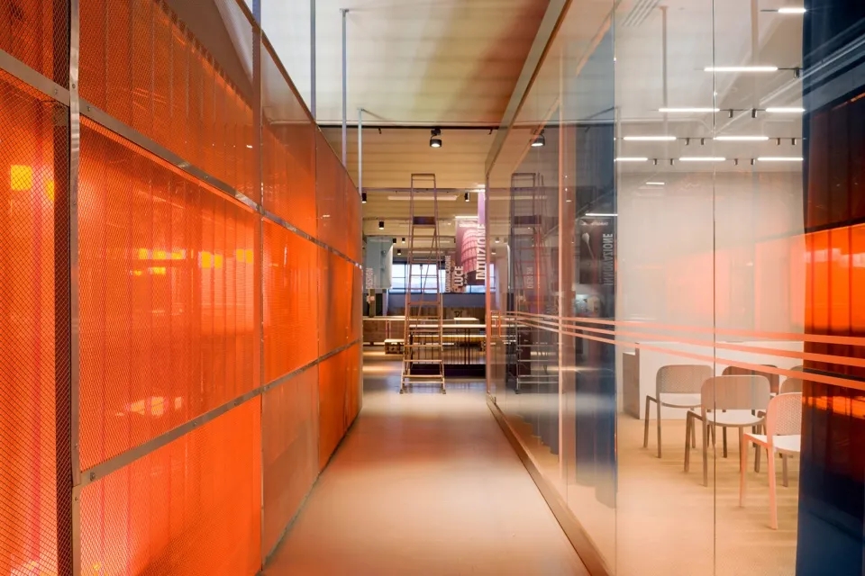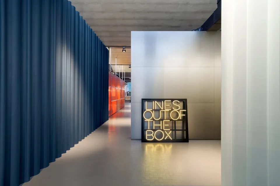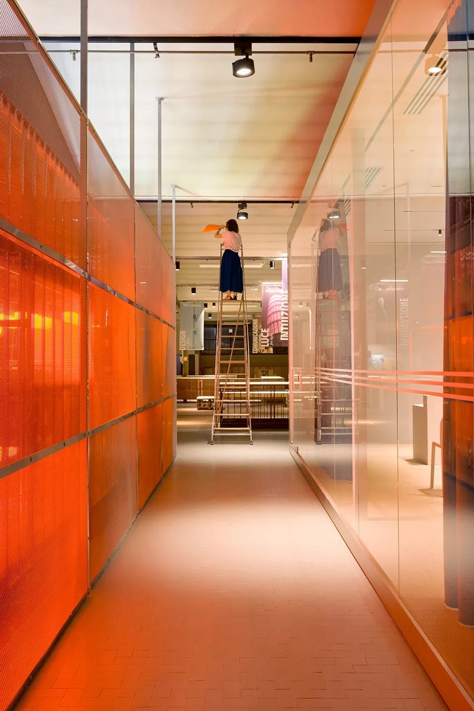 参观者到达接待区后,会被带到一个用于展示和介绍故事(例如:公司历史、新产品介绍、摄影展等)的蓝色电子区域。由发光玻璃平行管道构成的房间是实验室,在这里你可以参观、测试和试用照明灯具。观众席兼会议区是一个巨大的钢制空间,远眺着用于测试光源的红色PVC条“灯箱”。空间的尽头是以前的仓库,现在作为活动区使用。