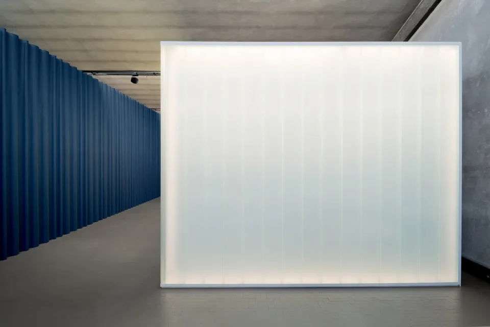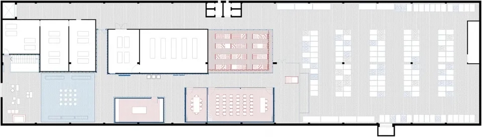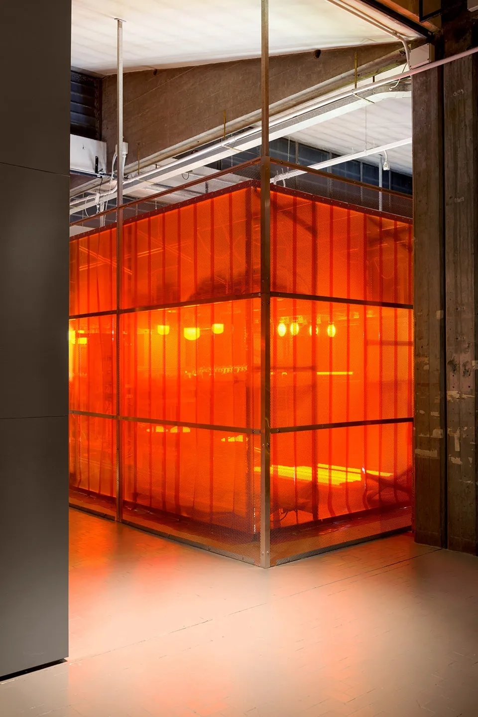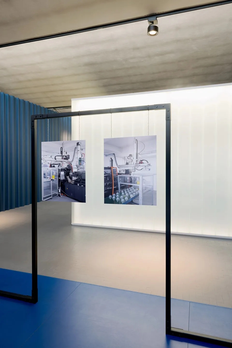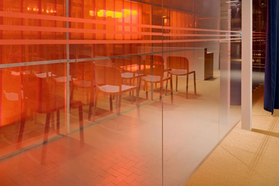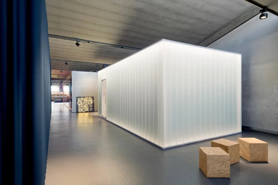 参观者到达接待区后,会被带到一个用于展示和介绍故事(例如:公司历史、新产品介绍、摄影展等)的蓝色电子区域。由发光玻璃平行管道构成的房间是实验室,在这里你可以参观、测试和试用照明灯具。观众席兼会议区是一个巨大的钢制空间,远眺着用于测试光源的红色PVC条“灯箱”。空间的尽头是以前的仓库,现在作为活动区使用。