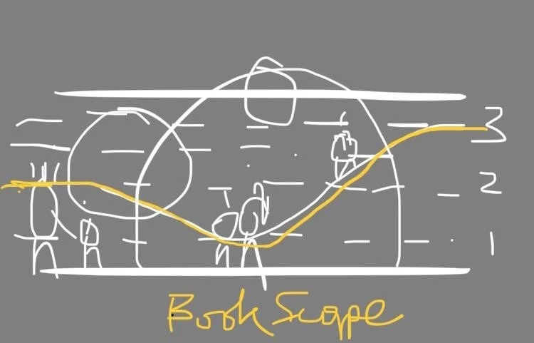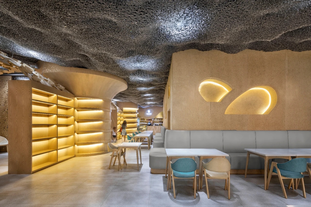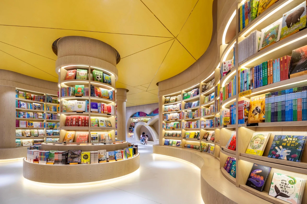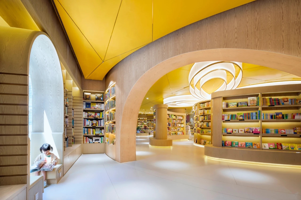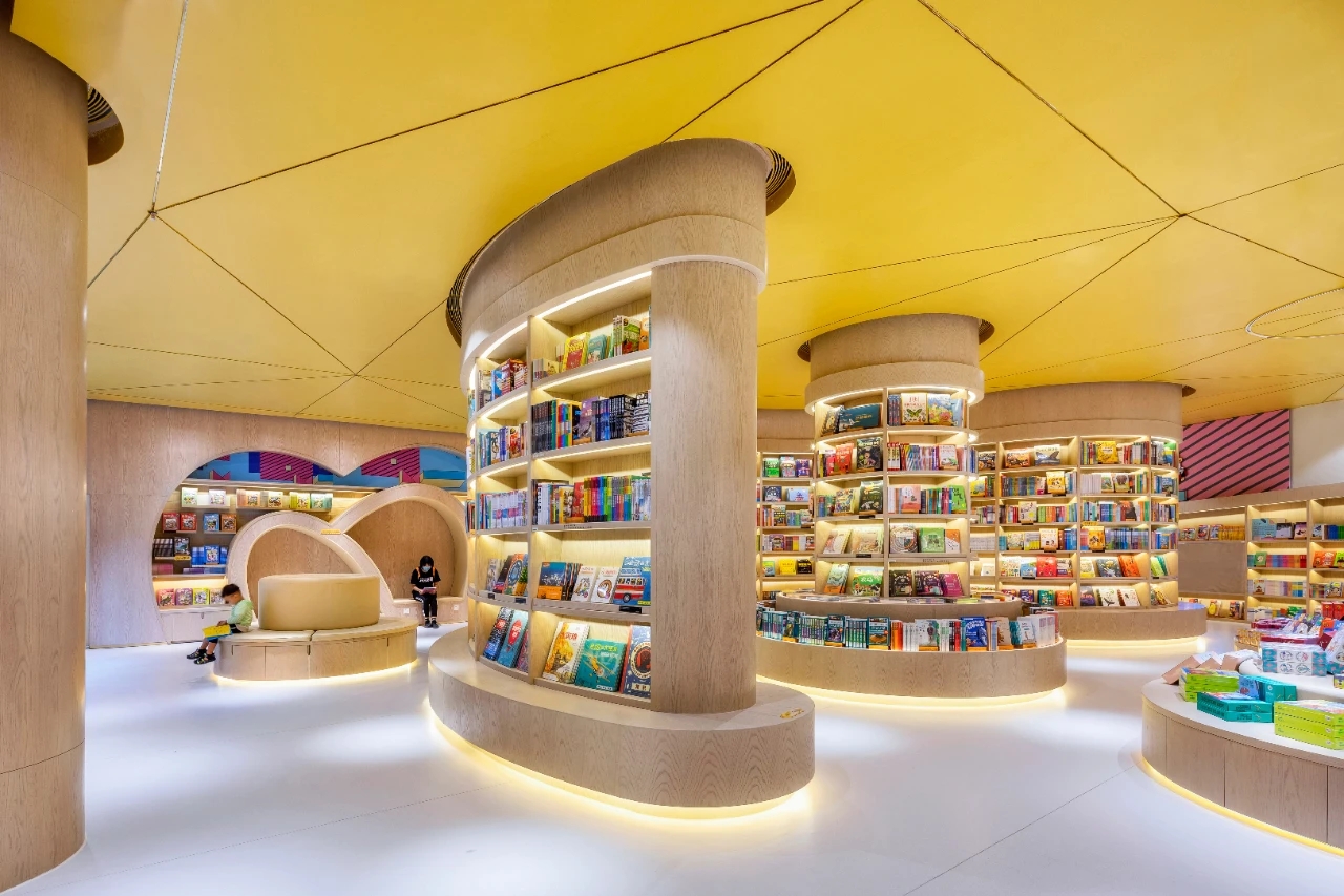 零售区域是一个售卖儿童绘本,图书和文具等不同类别产品的一个人性化空间,温暖的色调由天花的黄色和劝告木皮的墙体和书柜所创造。在不同的曲线组合上面我们创造了有开放式和私密式等不同的阅读区域,加上自然光线所赋予的一些阅读窗口,给父母和儿童一起在这个零售空间中沉淀心灵和专心阅读。