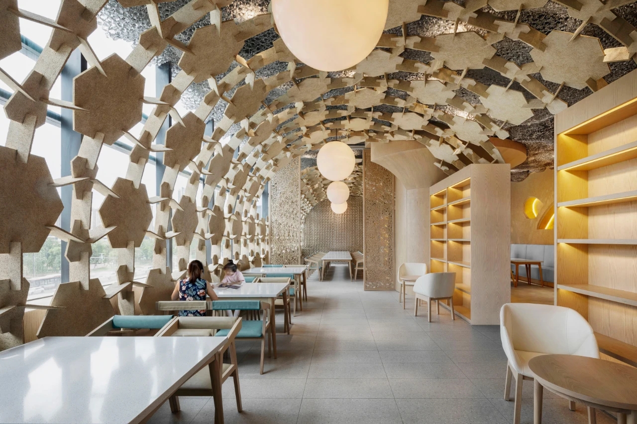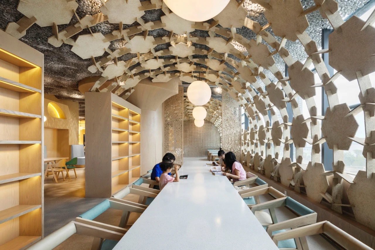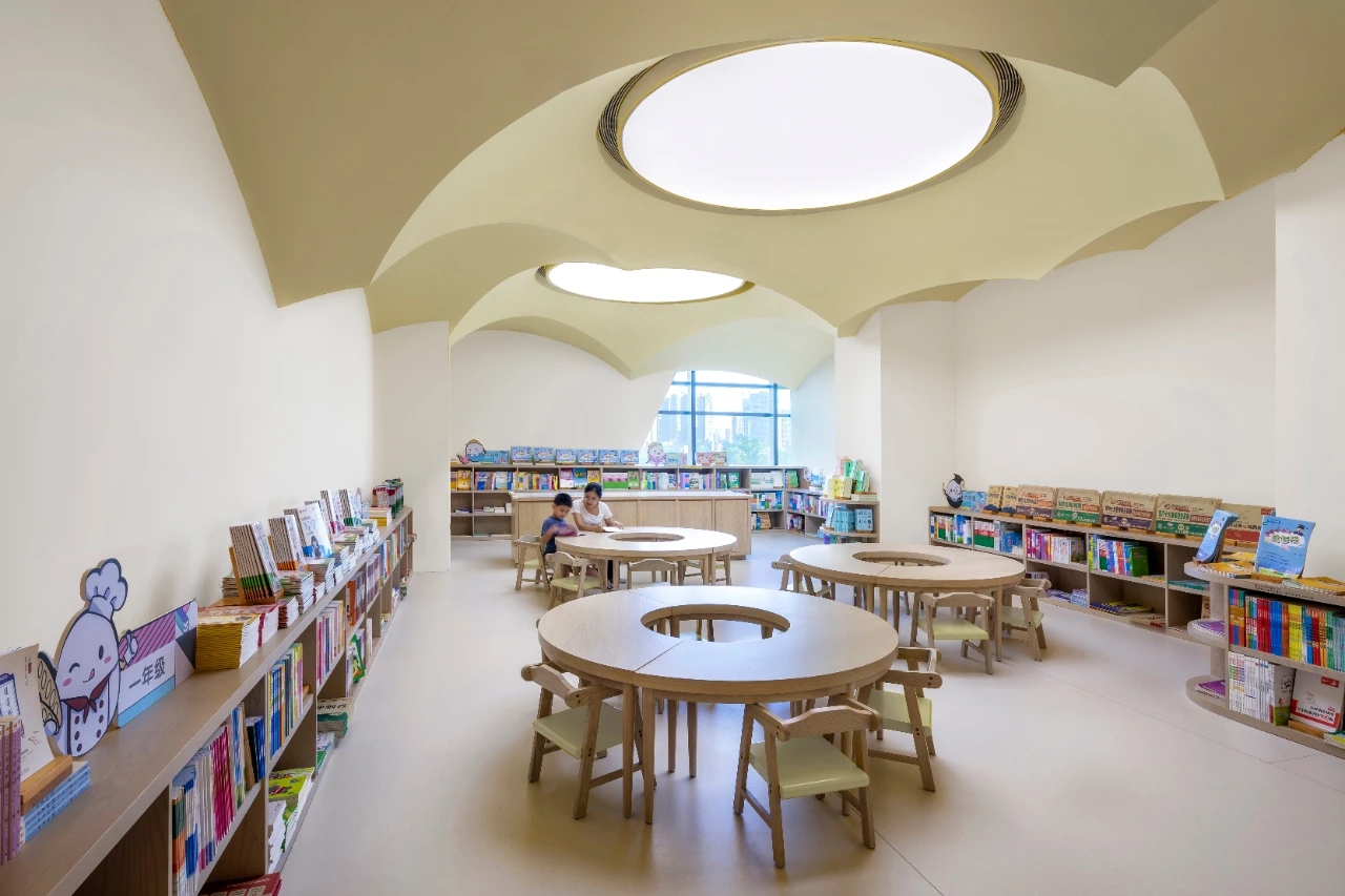 第二个区域是大小不一像洞穴一样的多功能教室。在有机造型的吊顶下面,小朋友可以在一个放松和充满激发他们创意的学习空间里面去吸收新的知识。