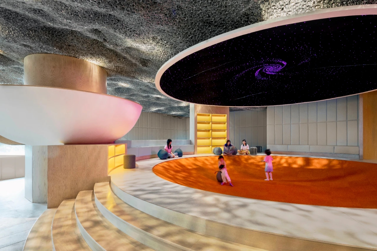 全高的书架把另外第四个功能区与亲子餐厅连贯一起,这是一个游乐区域。父母可以看到小孩子在一个360度圆形的开放式剧场空间里面进行游乐。平常的时候小孩子和父母可以在其中仰望天空,LED灯光所创造出来的星空景观激发他们的幻想力。在举办演讲活动和新书发布会的时候,这个空间的周围是读者的座位区域,让讲者可以在剧场中间利用圆拱形天花的声学物理现象,不用麦克风也能让每一位听众清除地听到他们的声音。