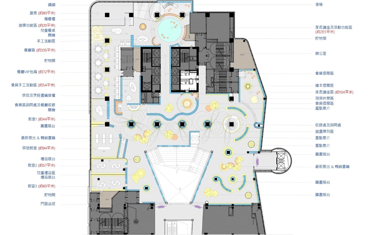 从平面布局开始,我们创造了一个像儿童故事书里面的户外花园的世界,给到小孩子有一个充满想象力和父母进行不同亲子活动的机会。建筑语言用了不同花园里面的符号和造型配合功能需求来打造不同区域的空间体验的氛围。