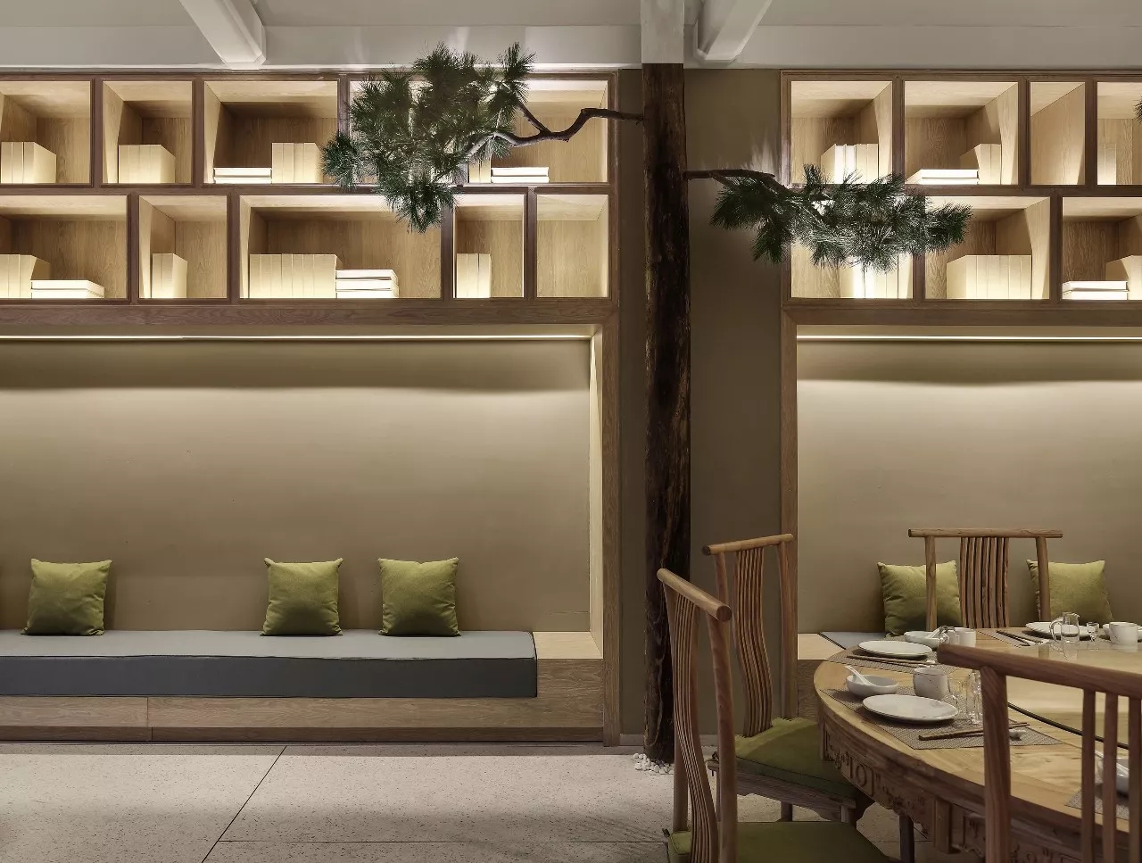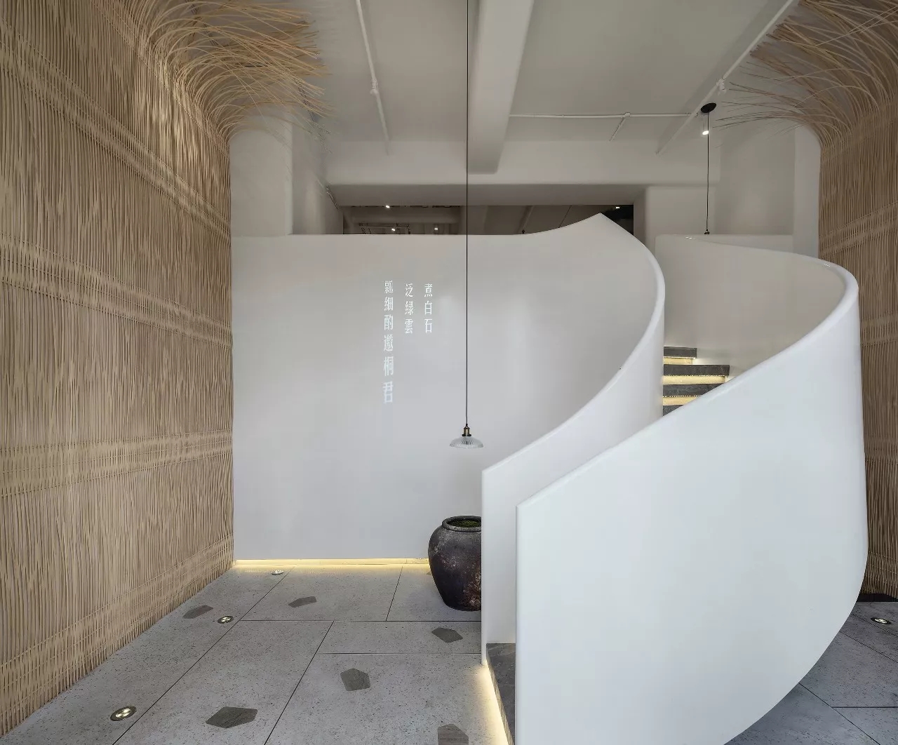 “煮白石、泛绿云、瓢细酌邀桐君”, 空间尝试以素雅浅色铺垫空间基调