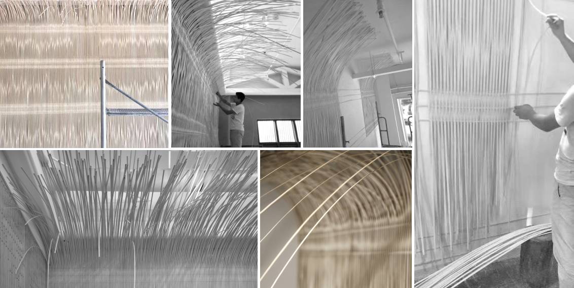 手工编织的运用,定制打磨竹条,在墙面编织肌理,在光影的互动下婆娑。