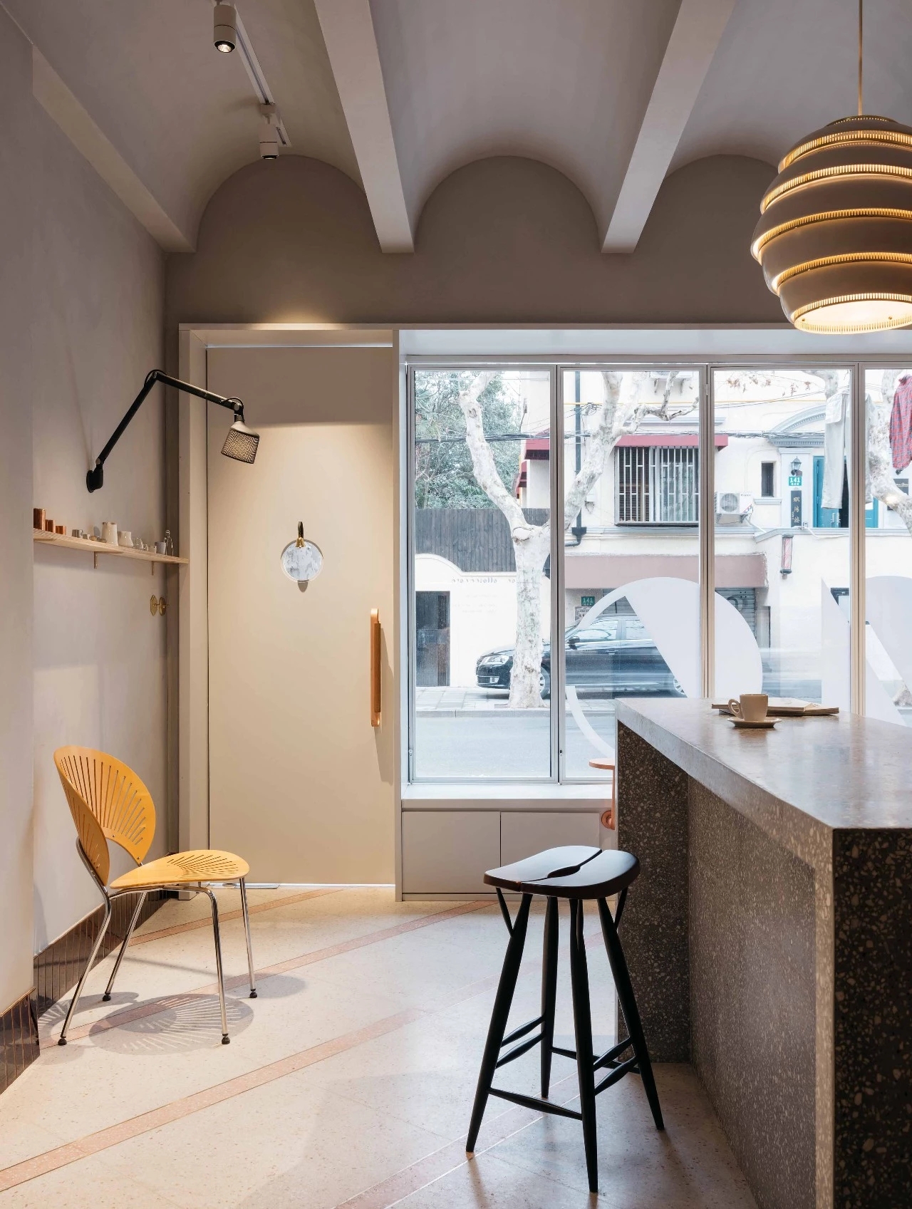 手冲咖啡的想象空间,设计师想把手冲咖啡制作过程中的记忆切片悄悄的放到空间里。冲泡水滴的状态,咖啡滤杯的孔,玻璃圆柱状的分享杯,咖啡豆被磨成粉的颜色,当这些切片对应到店铺设计不同的部分。门头的logo上的倒三角形是法语中的符号也是冲泡时水滴的样子。门上的大猫眼是滤杯的孔的隐喻,进去的身影仿佛一个个咖啡粉末颗粒,到过的客人才是咖啡空间里不同的风味。顶面和门头的弧形其实是看不见的玻璃杯负形,只是真的太透明了而已。其实这里有个Bug,本来两个弧形的门洞也是半圆的,考虑到高度很容易碰头才调整成两边圆角处理。操作吧台背后的咖啡色瓷砖和踢脚瓷砖,虽然踢脚线在建筑范畴中不是那么纯粹的存在,但是真的可以使这样的空间更耐用一些,建筑师西扎在他的建筑还一直保留墙裙的设计,有时耐用的处理与生活更接近一些。