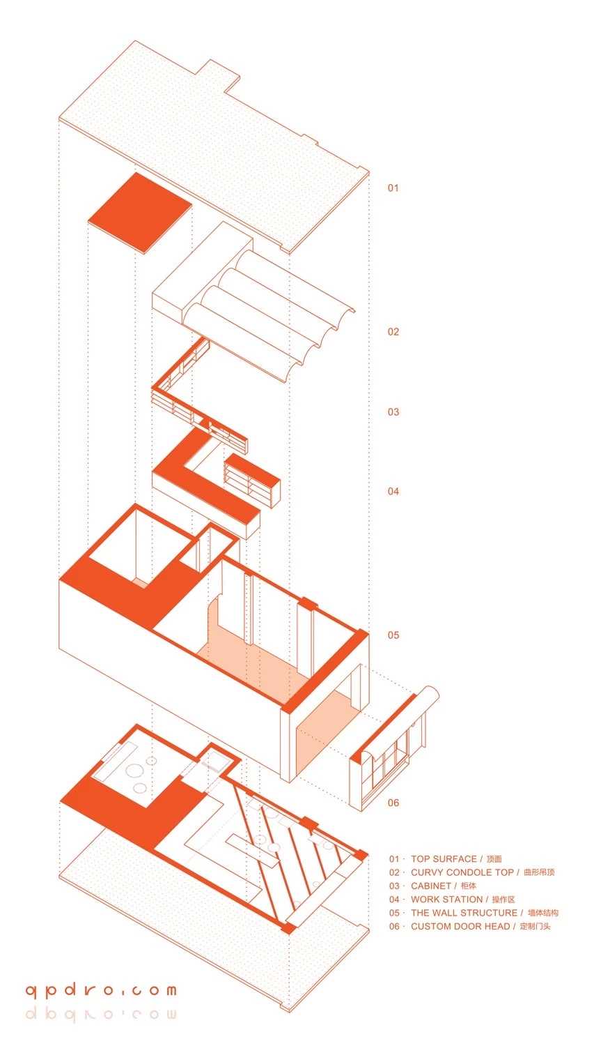整个店铺的外立面设计是采用嵌入式设计,原先的构想是制作好后,运输到现场整体安装,但实际执行由于运输和安装的关系被拆解成三个独立的部分,弧形的雨棚门头;飘窗和竖向支撑框;门和折叠窗。嵌入式设计可以限度保留那些纪录性的部分,也是与老建筑共处的一种边界处理。