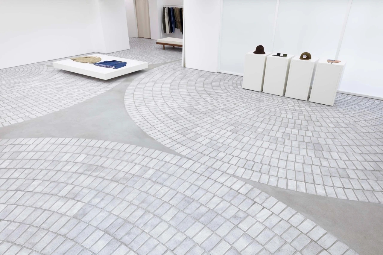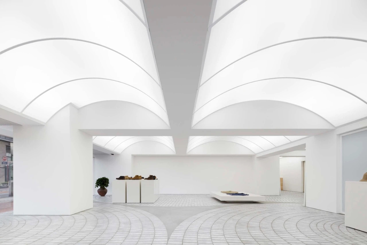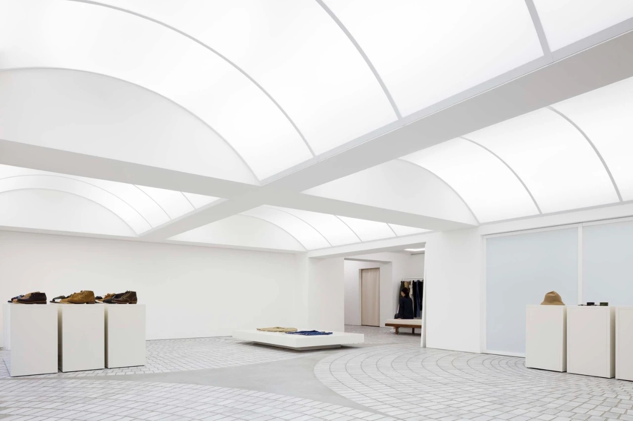 实现的内部空间的质量就像雕塑博物馆的院子一样,在这种光线柔和的环境中展示鞋类和服装。