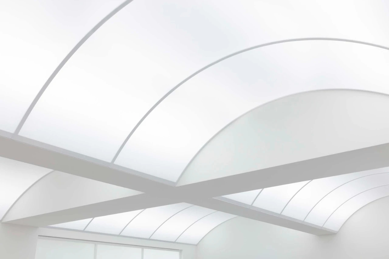 在这里,我们试图将这种环境氛围甚至带入商店内部。拱形采光天花板设计为利用许多结构光束,可提供无阴影的光线。