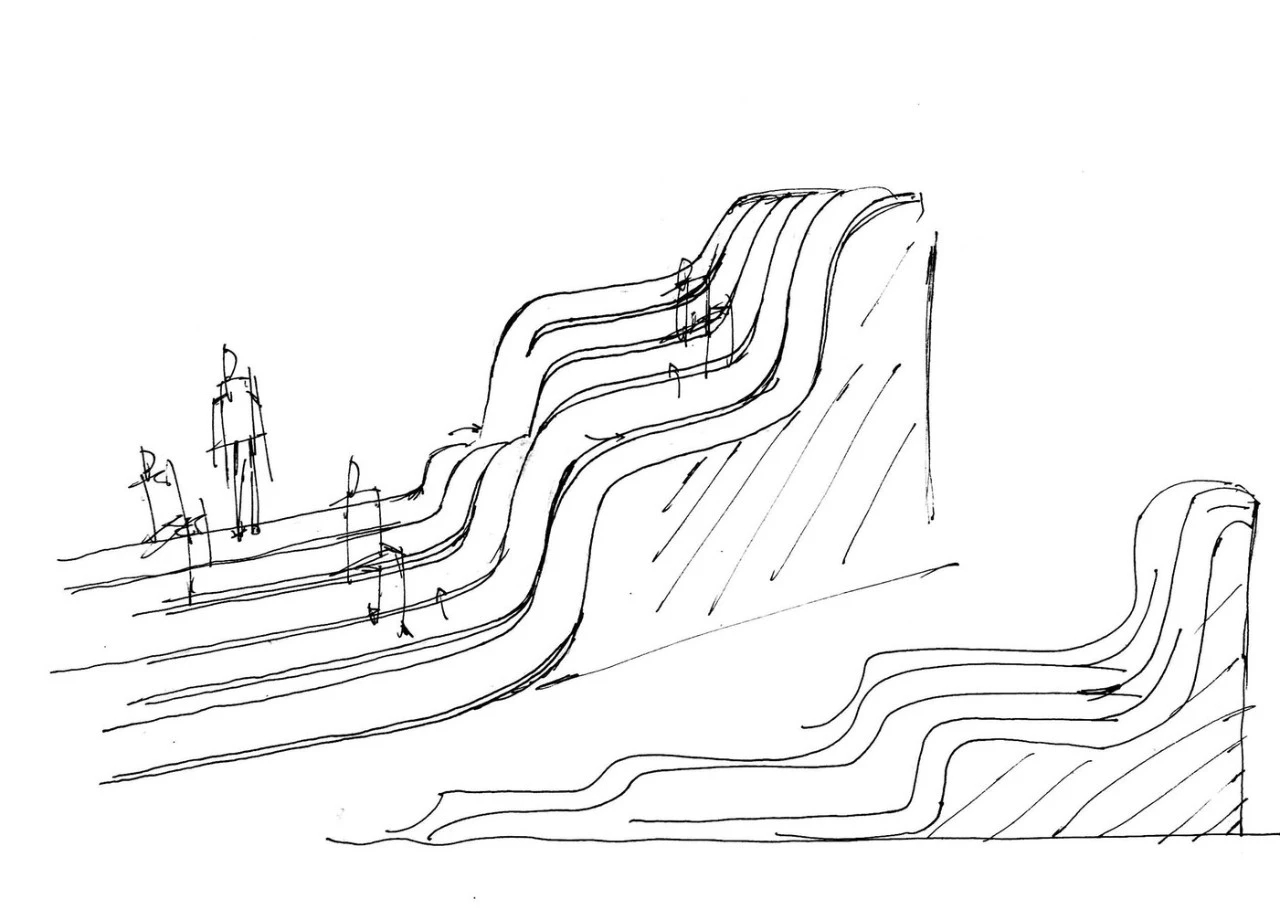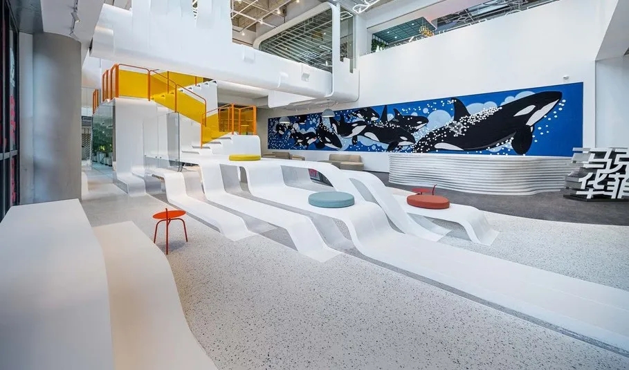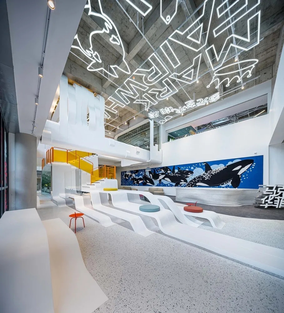 波浪造型的前台呼应了墙面的鲸鱼。可用作临时活动聚集点的梯级造型兼具美感与实用性,如同白色的海浪奔涌而来。