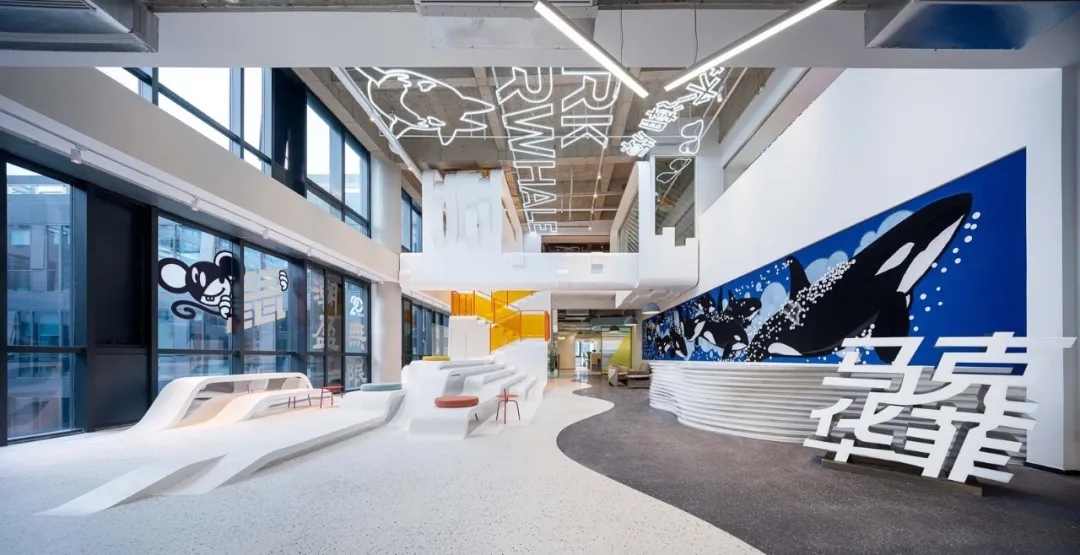 一楼是来访客户的接待区,墙面最显眼处运用了马克华菲品牌英文名“ Mark Fairwhale ”中的“ Whale ”(即鲸鱼之意)作为主体元素,贯穿整个大厅空间。