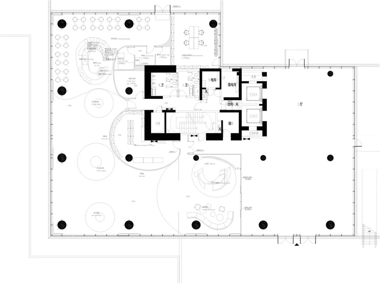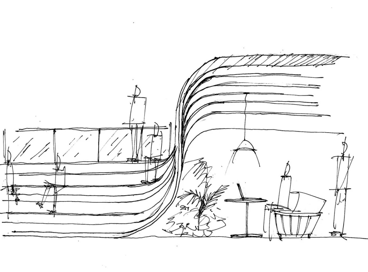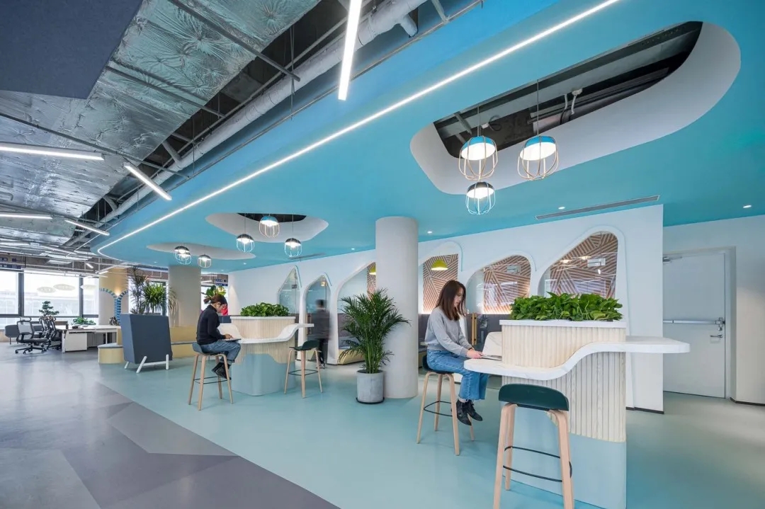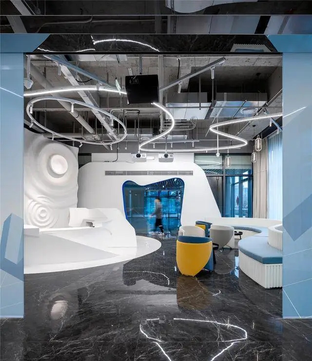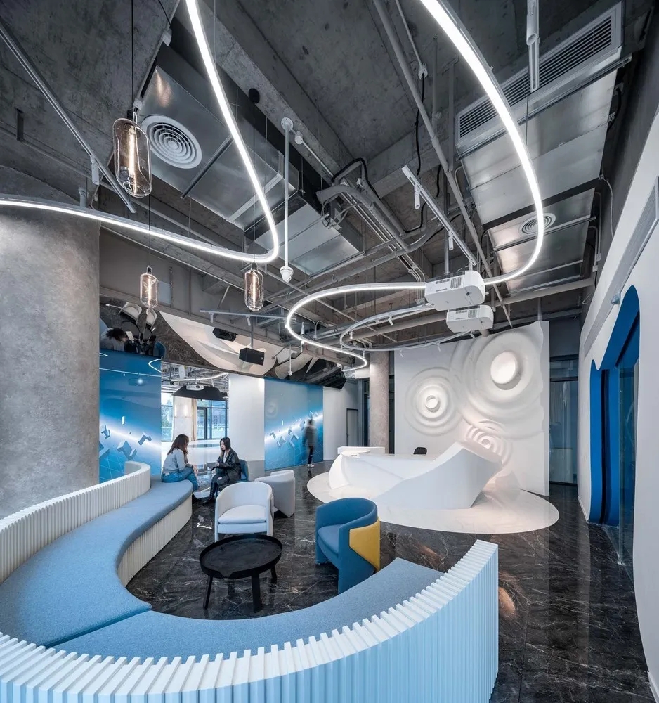 设置水吧和简餐接待访客。水吧的造型如同鲸鱼在水中跃动的留下的涟漪,在空间内不断强调品牌基因。