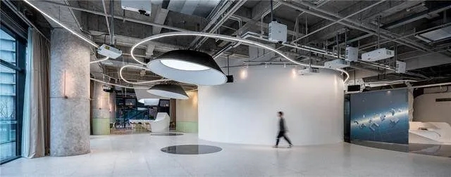大厅内巨型互动投影不间断投射在空间各处播放视频,访客能充分感受品牌精神与公司文化。前台与水吧之间留出空间可拓展用作举办各类互动或临时展览。