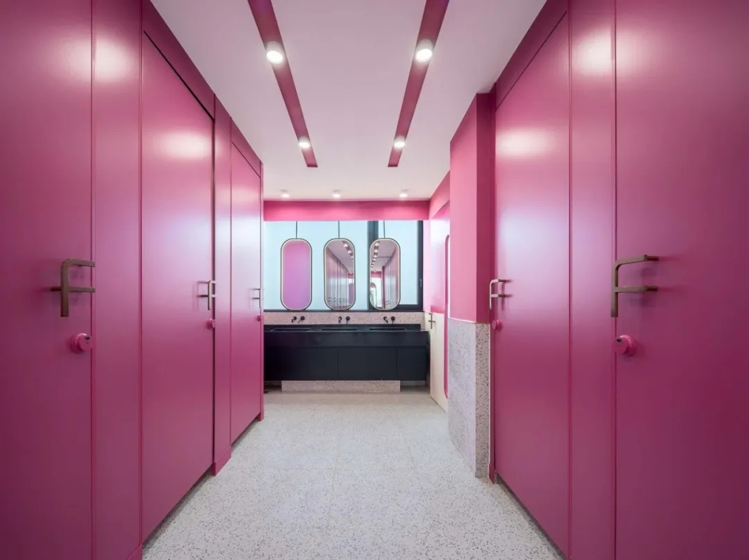 就连洗手间都充满大胆的配色,高辨识度的颜色加上定制的门把手,不断强调着马克华菲打破常规的「多元艺术潮牌」特性。