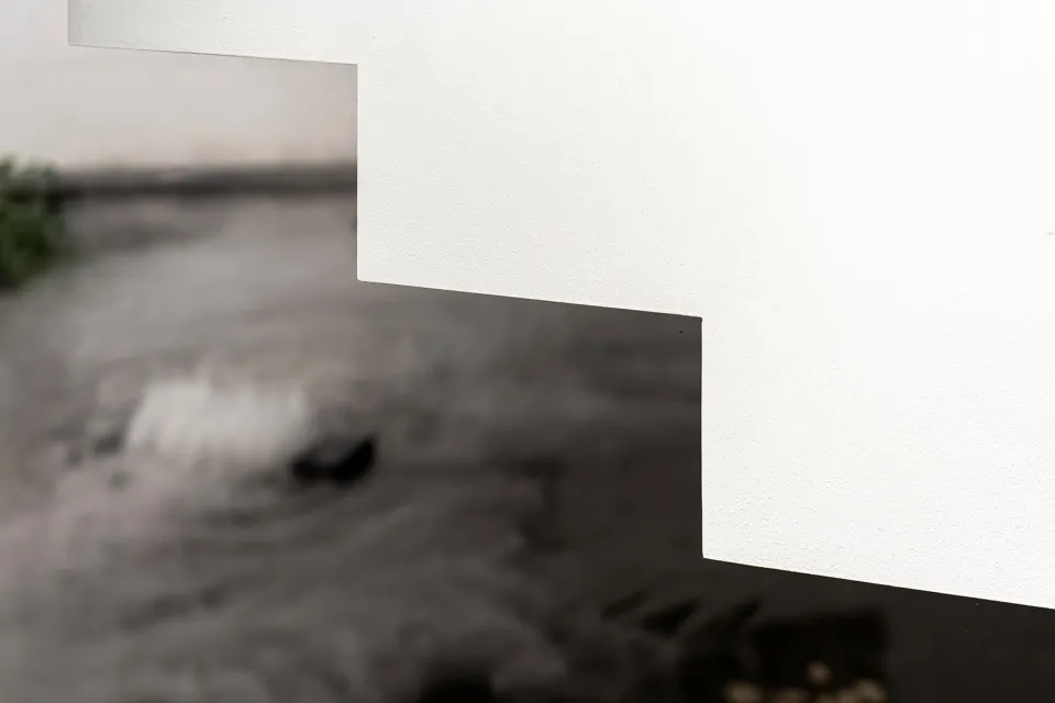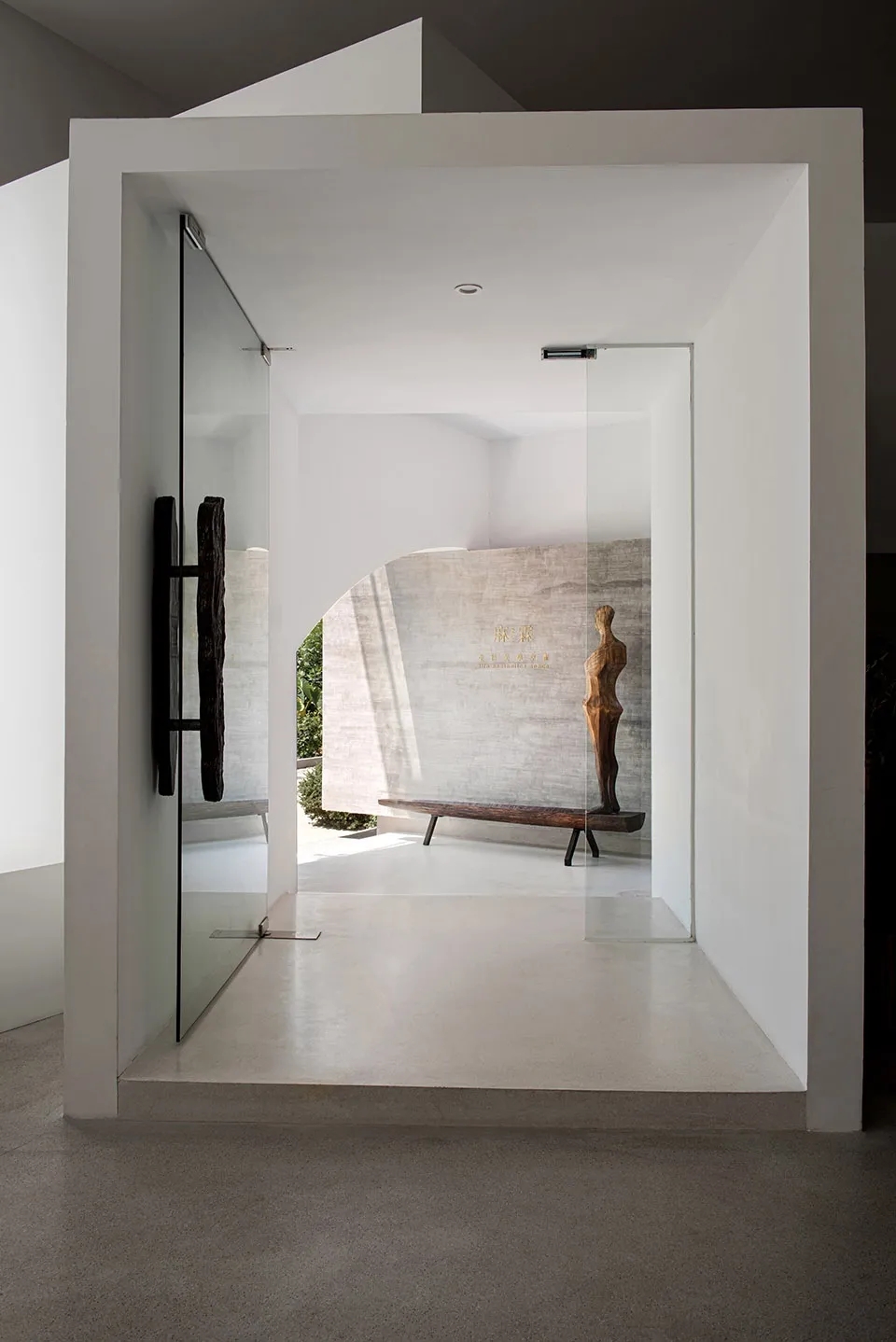 入口处的弧形体块与水泥墙面做了结构穿插,模拟出钻入一片苎麻丛的状态,形成独特又新颖的视觉感。内退空间区域作为展示区与盒子造型的门框相连,巧妙地模糊了空间边界,内外形成一体。