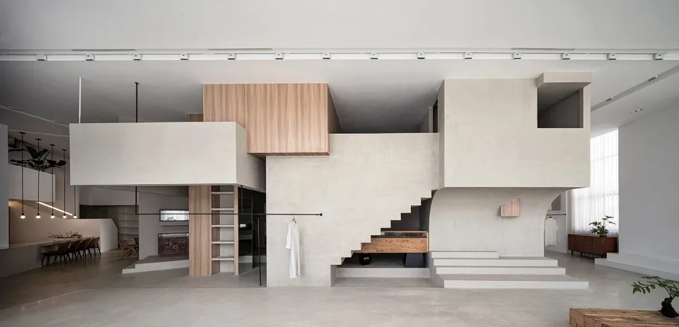 空间在改造前是普通的办公仓库,设计师沈墨和张建勇在经过构思后,运用“在房子中做建筑”的思维,合理地划分出独立又互相连接的区块,最大化满足了客户的需求。