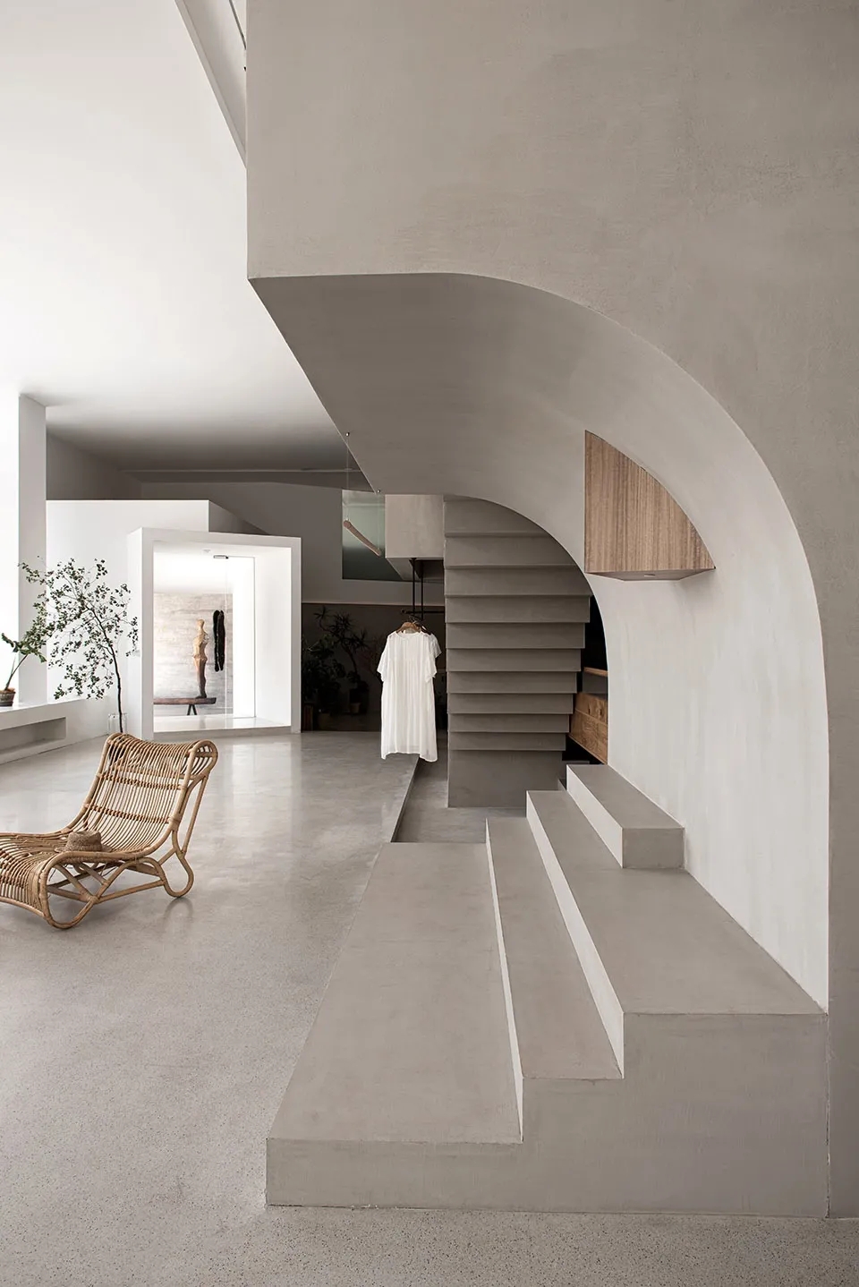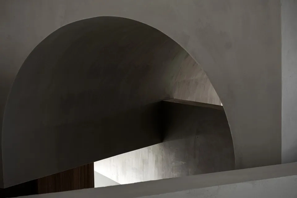 在观察苎麻叶卷起的状态后,设计师在空间中融入拱形的结构,为空间增加趣味点与造型感。原色的木头与灰色涂料组合出朴素的色调,呈现出大自然的颜色。